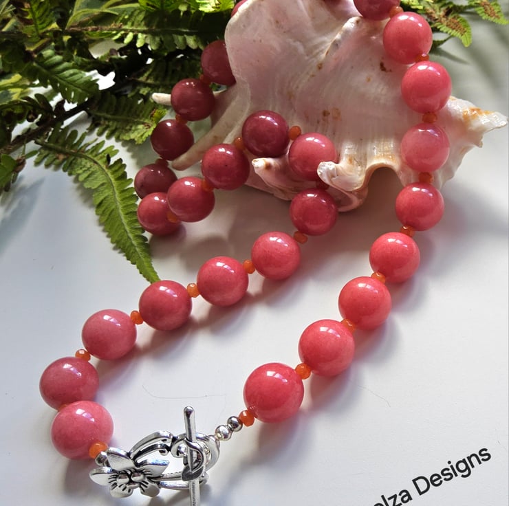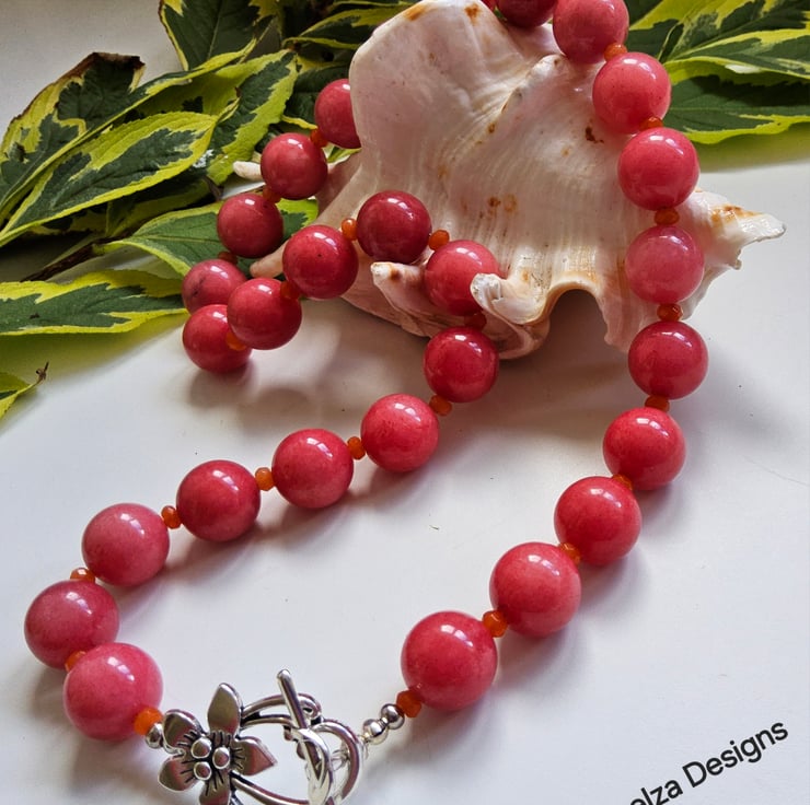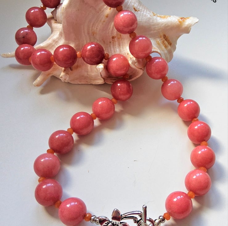 A fashionable affordable statement necklace designed and hand crafted in Cornwall using large 15mm smooth deep peach coloured quartz gemstones. To compliment them 3mm faceted orange quartite roundelll cut gemstone beads sit between each quartz stone. This very fashionable necklace can be worn with the over large statement flower clasp at the front, which is on trend if preferred.