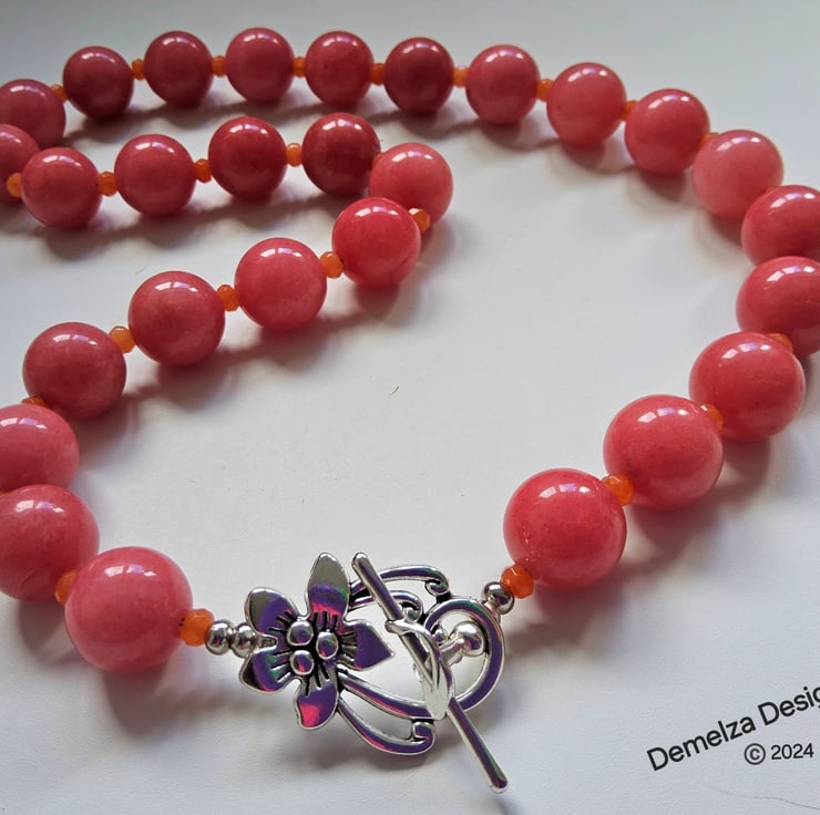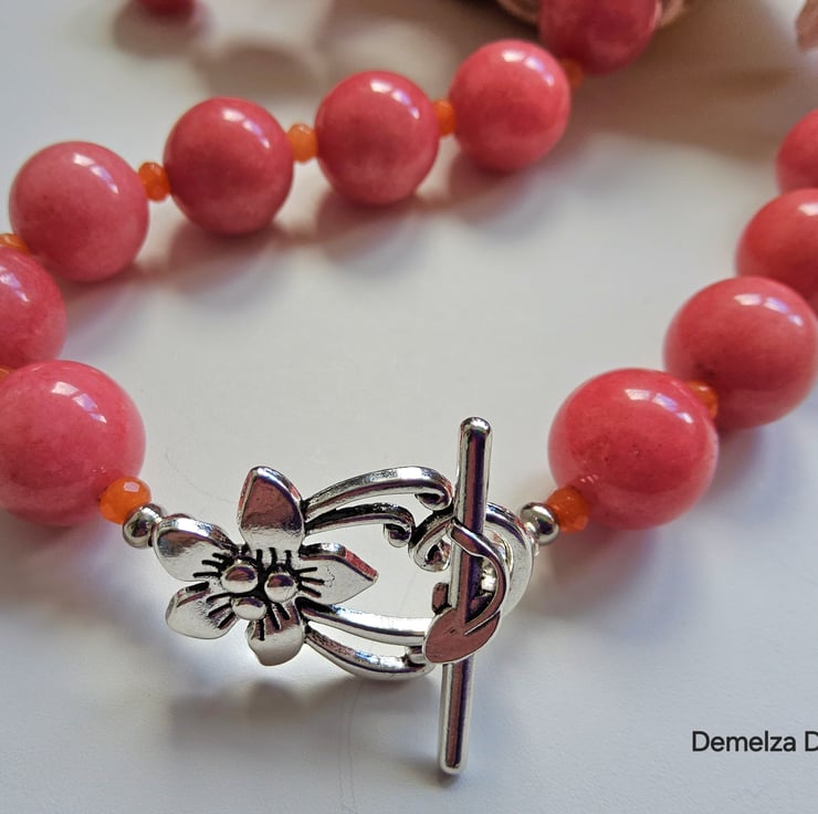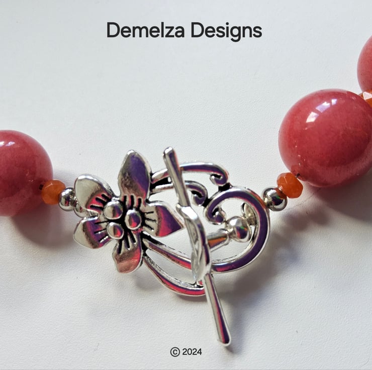 The item has been constructed using professional coated stainless steel jewellers wire for added strength and lasting durability, finished off with a quality silver plate decorative large flower design toggle style clasp and crimp covers.