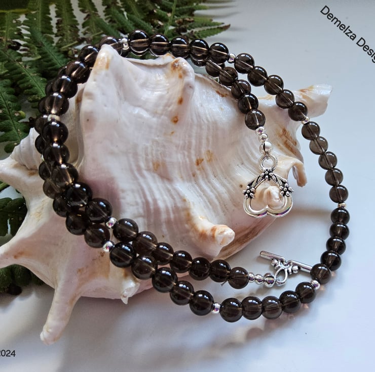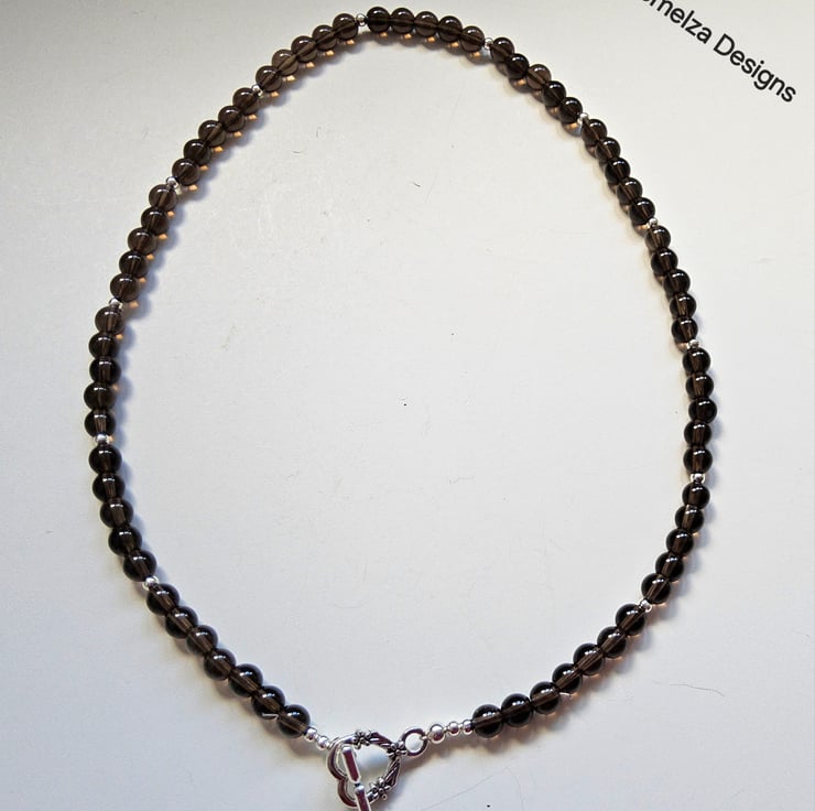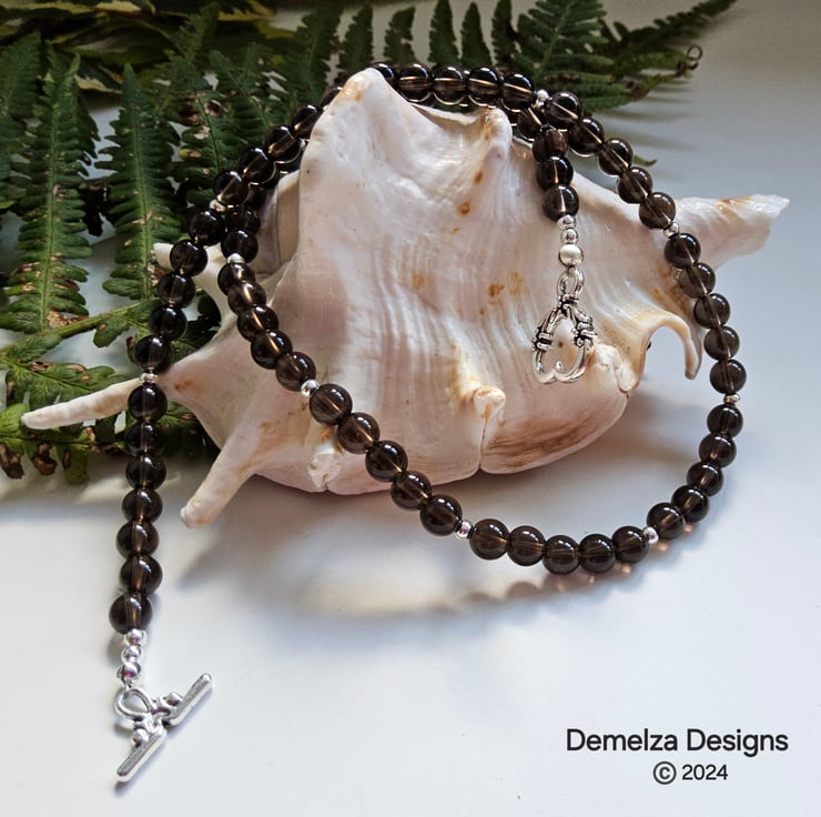 An affordable dainty necklace designed and hand crafted in Cornwall using 6mm smooth cut round AA graded natural smokey quartz gemstones. To compliment them 2.5mm rondelle silver plated spacer beads sit between each quartz stone. This very elegant sophisticated necklace can be worn with the decorative clasp at the front of the neckline if preferred, which is very on trend at the moment. These gemstones have exceptional strong colour and clarity!