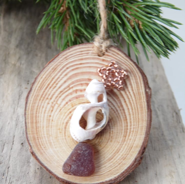 A cute sea shell & sea glass Christmas tree with one of my hand beaded copper stars.