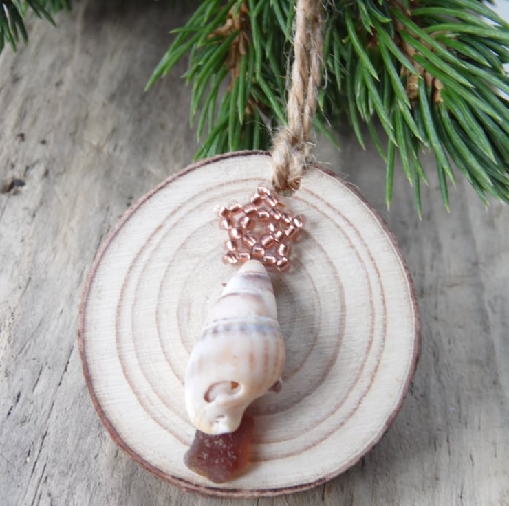 A cute sea shell & sea glass Christmas tree with one of my hand beaded copper stars.