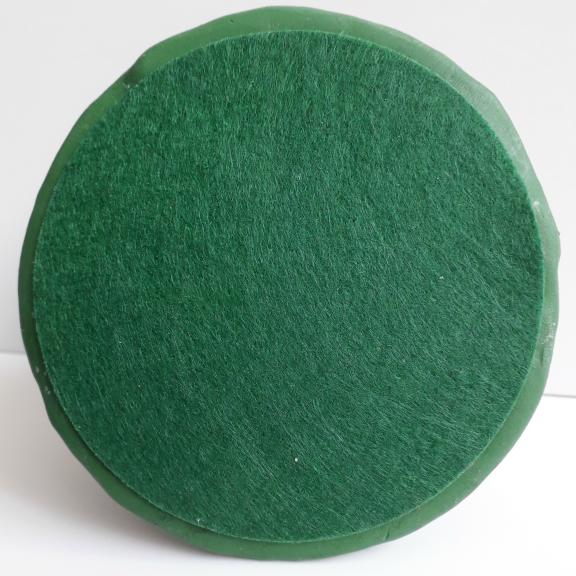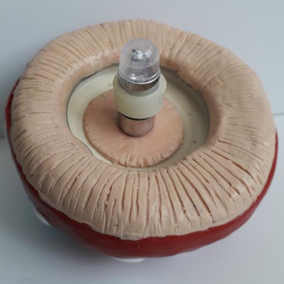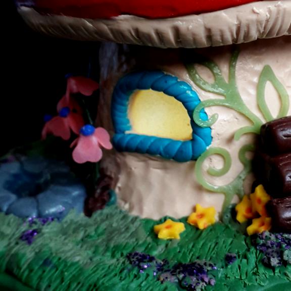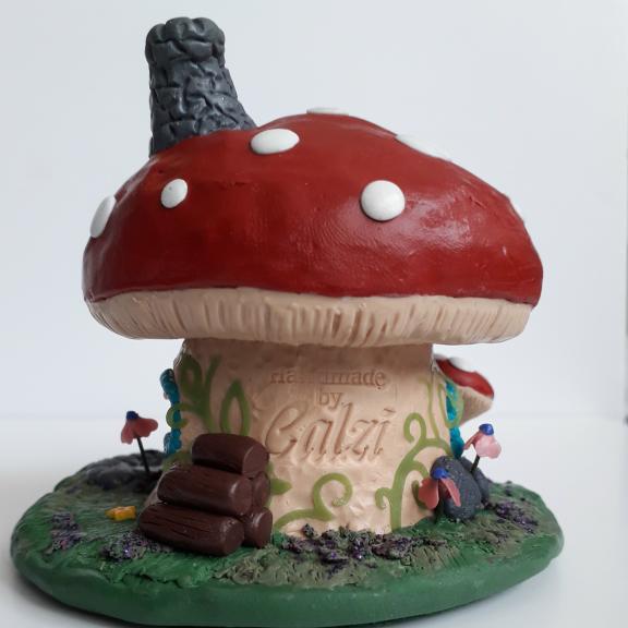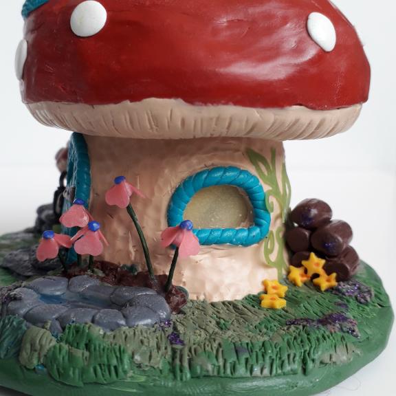 A mushroom fairy house made with polymer clay around a small jar, it is 9cm tall on a 10cm base.