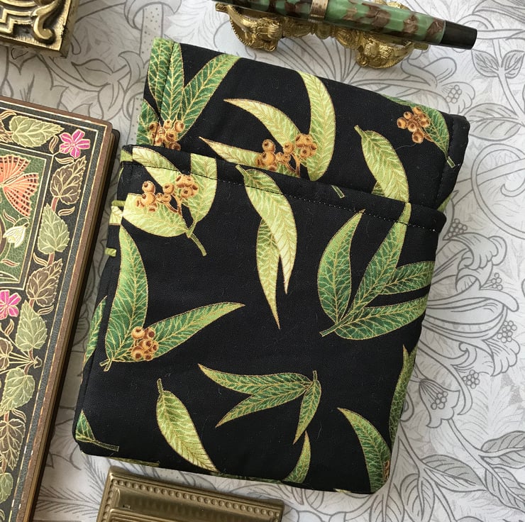 The outer, padded case contains a removable stiffened insert with fabric loops to hold, separate and protect the pens. Each case is made from 25 pieces of fabric. All visible fabrics are 100% cotton. Three types of interlining provide cushioning, support and stability. The pen slots are 10 cm long so give excellent protection and will house all but the chunkiest of pens, while the tuck-under outer flap adjusts to accommodate extra-long pens. There is space behind the insert in which to tuck a note of pens and inks, plus a small slim notebook (such as the Lamy A6 soft cover booklet, available from Cult Pens). Only a very limited number of each case will be made.