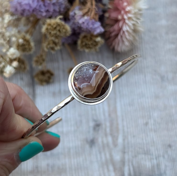 Handmade in Bristol, UK, this bangle is a unique one-of-a-kind piece, perfect for those who appreciate natural stones with character. The simplicity of the silver band highlights the agate's intricate patterns, making this bangle ideal for both everyday wear and as a meaningful gift. Its timeless design celebrates the beauty of handmade jewellery, blending elegance with organic elements.