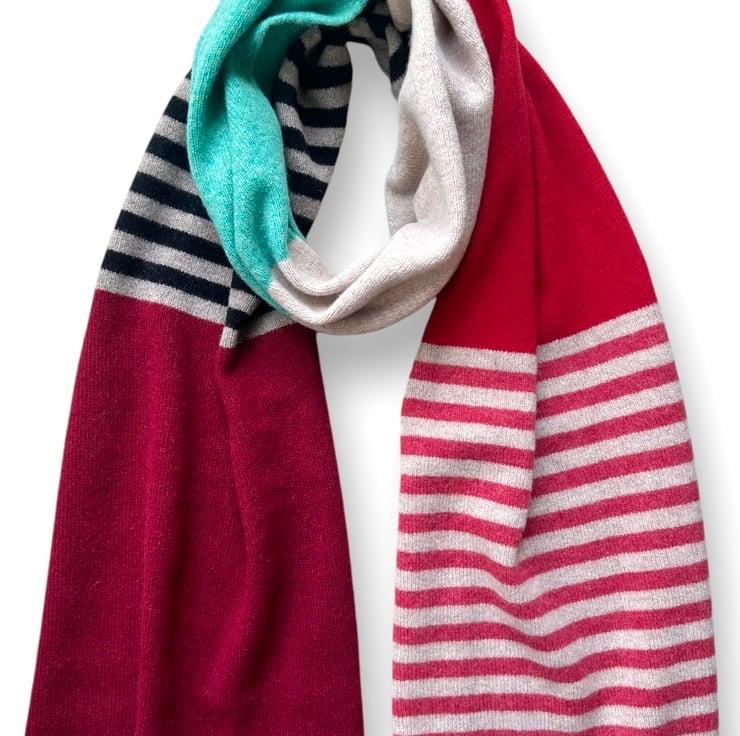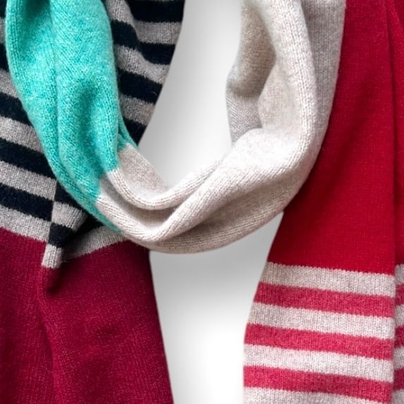 100 % Merino Lambswool Colourblock and Stripe Scarf. A Big scarf to wrap up in at 210 cms x 38 cms.