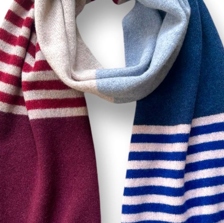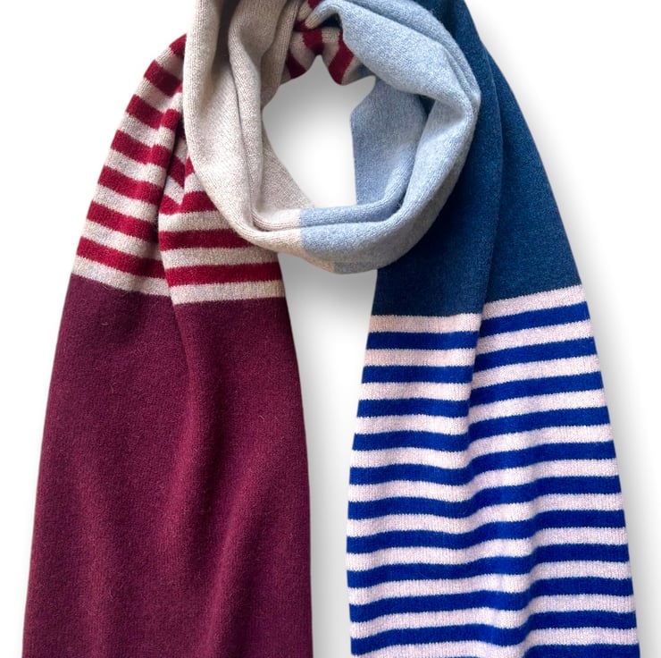 100 % Merino Lambswool Colourblock and Stripe Scarf. A Big scarf to wrap up in at 210 cms x 38 cms.
