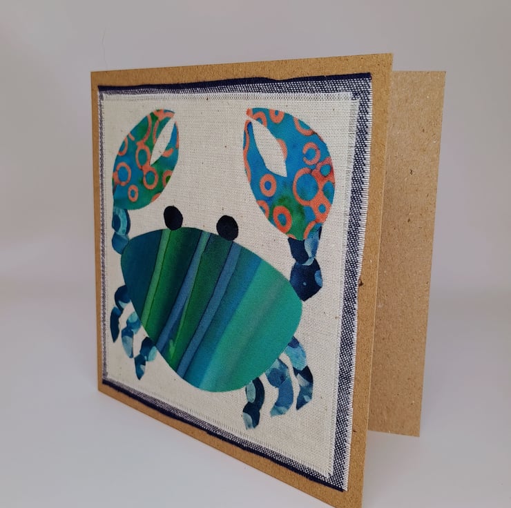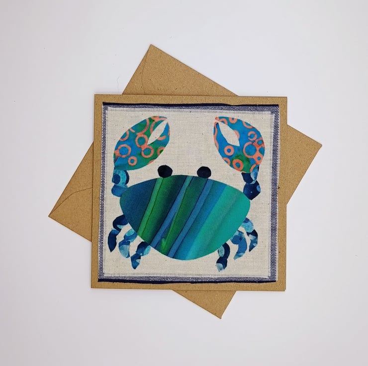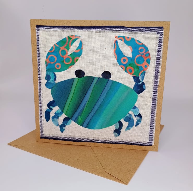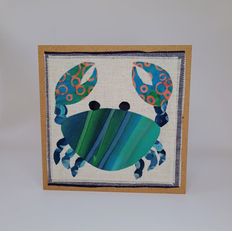 Multi coloured batik cotton fabrics make this collage ‘Crab’ stand out from the crowd. Mounted on a natural calico square, finished with a complimentary sea blue fabric border.
