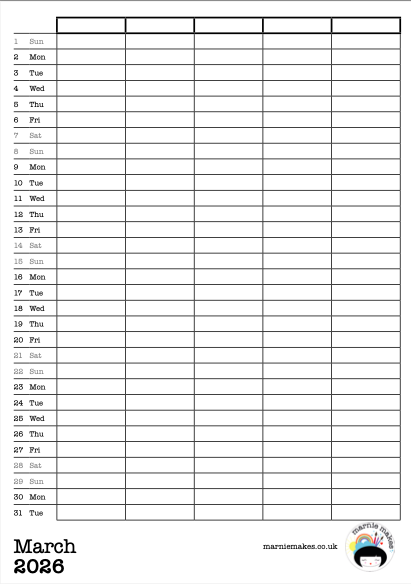 Celebrating it's eleventh year, the Marnie Makes family planner style calendar is the perfect way to ease gently into the new year to come ! A double A4 portrait calendar (opens lengthways) are printed on 210gsm silk stock card and consists of 13 pages; 12 pages with full colour to both sides, and 1 page of full colour to one side and black print on the back. Each month has a beautiful illustration to make you smile ( and when you're done with the calendar you can frame the illustrations), has 5 smaller sections per day for notes (for separate family members), is wire bound and has a hole punched for ease of hanging. It will be cello-packed in either a board-backed envelope or postage box depending on quantities and posted Royal Mail 2nd class.