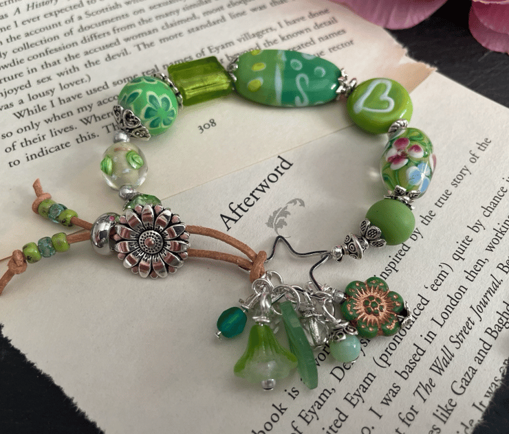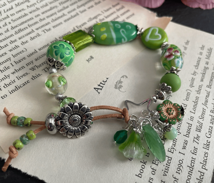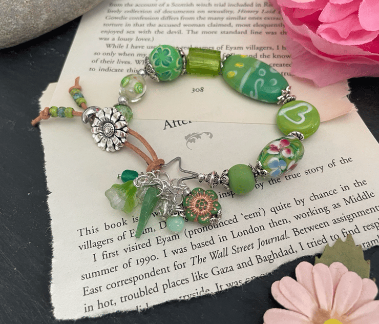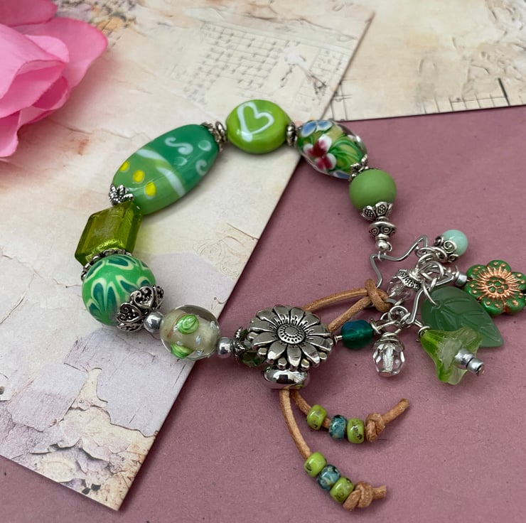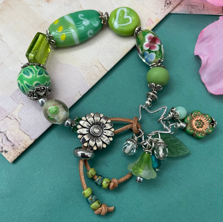 Beautiful green glass beads create the perfect setting for this unique one of a kind bracelet. A gorgeous selection of Lampwork handmade glass beads, Czech fire polished beads,gemstone beads, picasso Czech beads come together beautifully, linked using silver tone bead caps and findings.