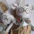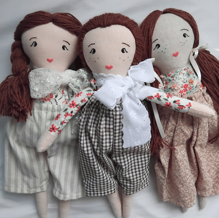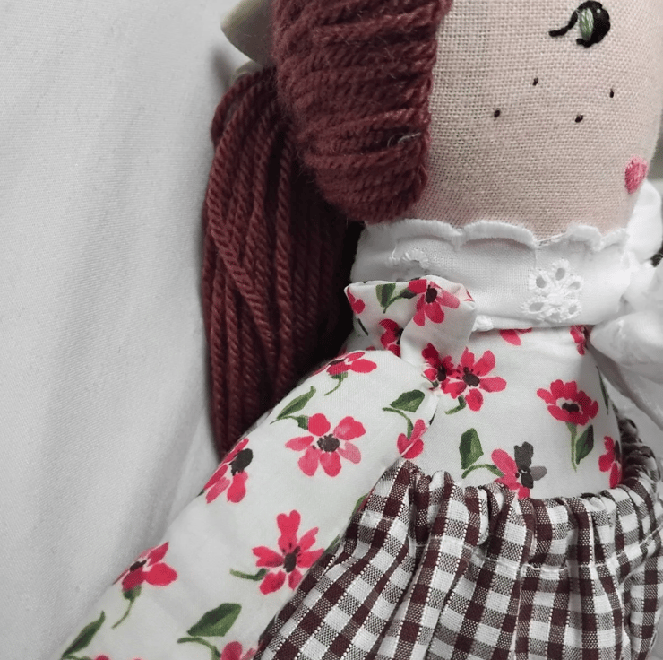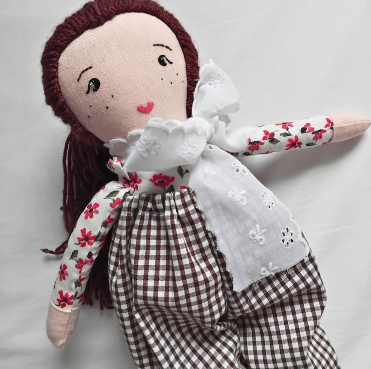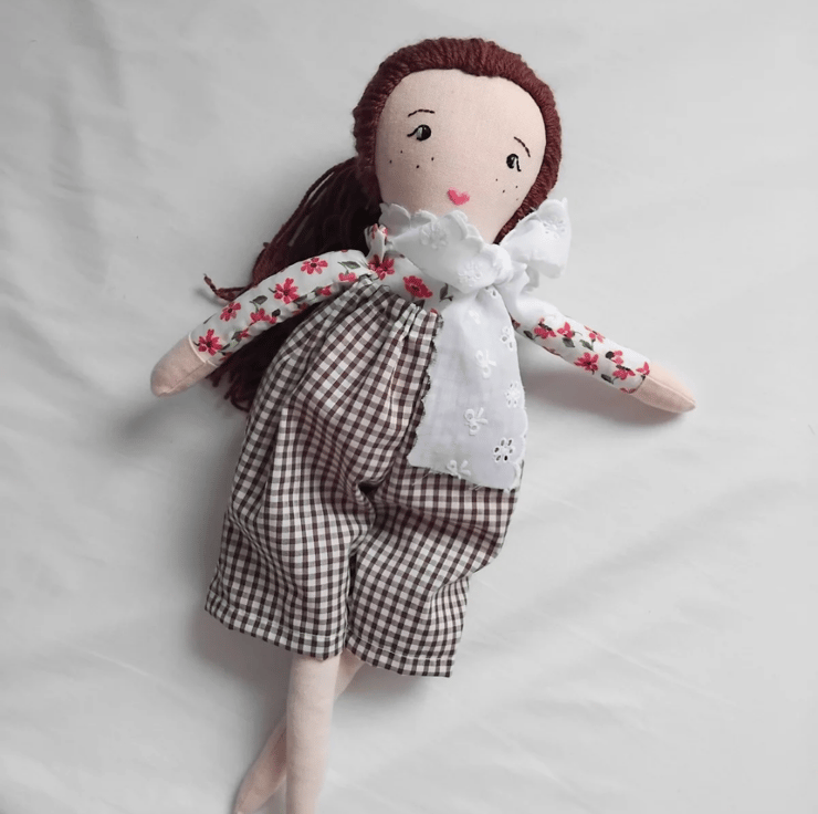 This handmade heirloom doll is 40cm from head to toe. She is made from Essex linen and a gorgeous red floral print cotton. Her face has been hand embroidered and her dark brown hair is tied in a ponytail with an olive green velvet ribbon. She is wearing dark brown and white gingham, wide leg trousers and a white broderie trim in an oversized bow around her neck.