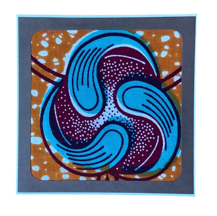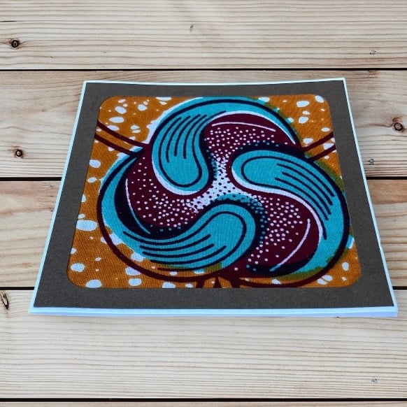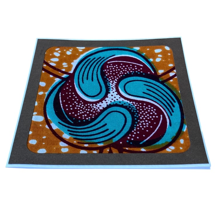 This 6 x 6 card has been made using African fabric remnants applied to a white hammered base card with a brown card surround.
