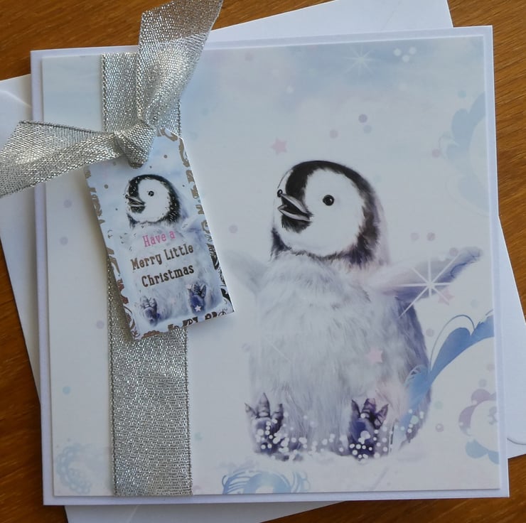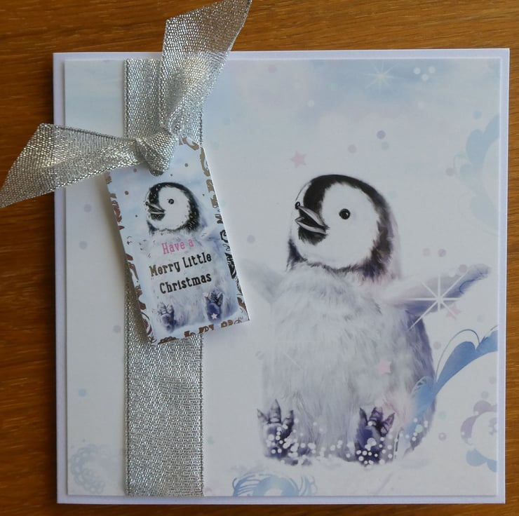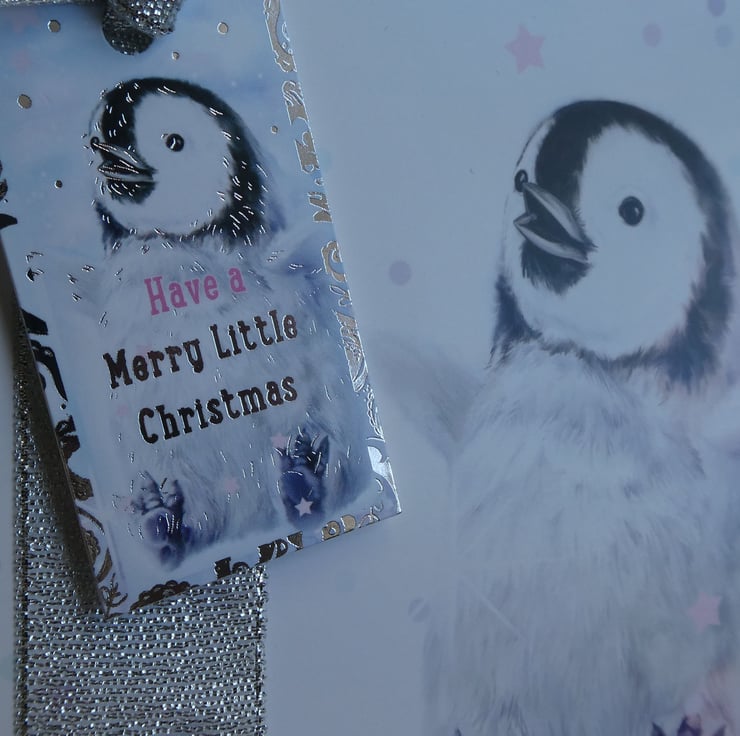 A band of silver metallic ribbon has been wrapped from top to bottom on the left hand side of the card, topped with a tag shaped message with a smaller penguin image and the greeting Have a Merry Little Christmas. The tag has been tied with matching silver ribbon and raised on foam pads.