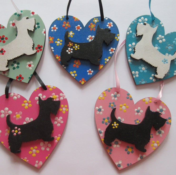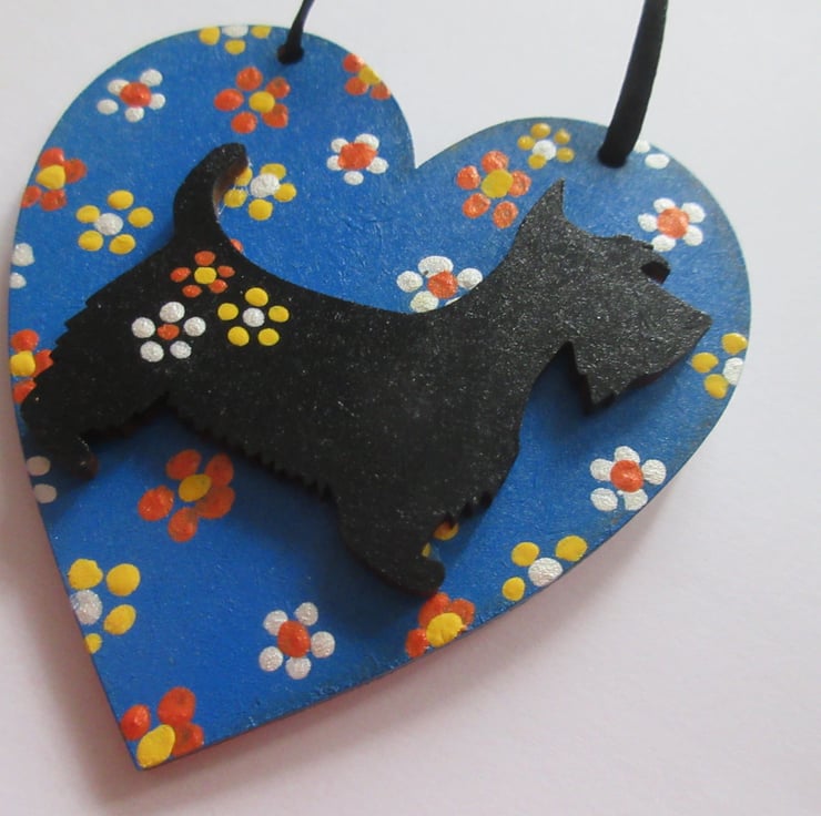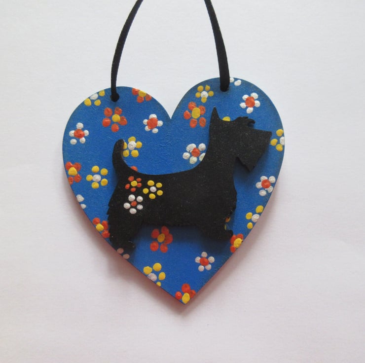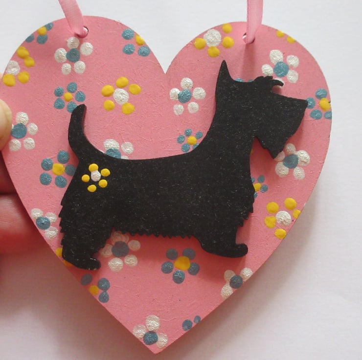 This is an 8cm x 8cm wooden heart shape, hand painted, and embellished with a wooden hand painted scottie dog.