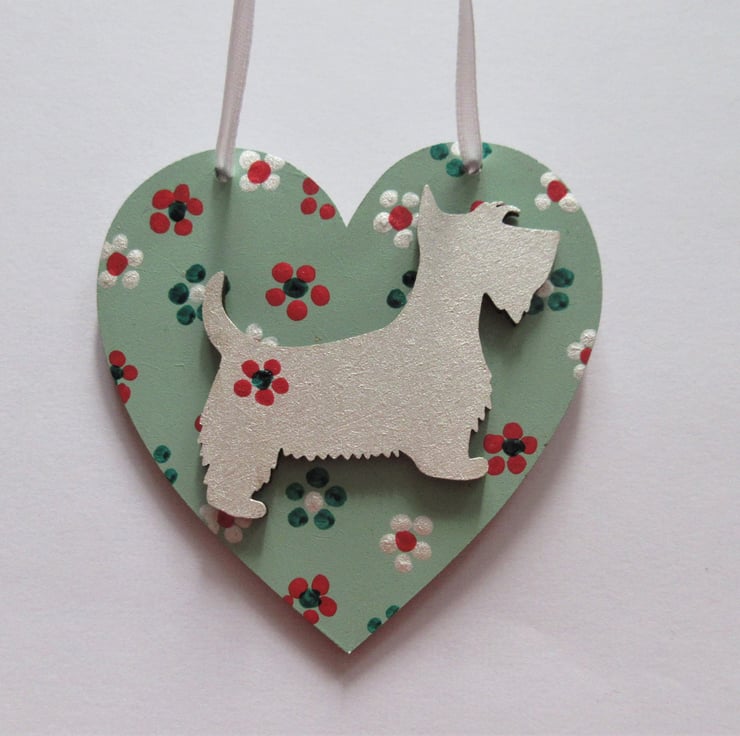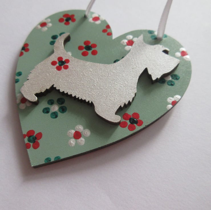 This is an 8cm x 8cm wooden heart shape, hand painted, and embellished with a wooden hand painted Westie dog.