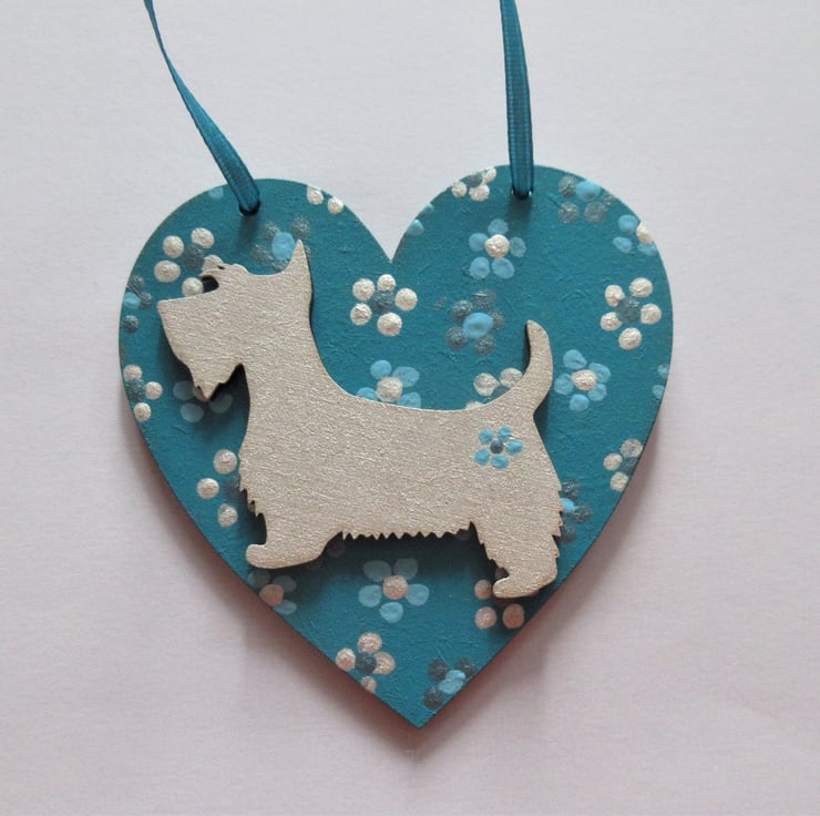 This is an 8cm x 8cm wooden heart shape, hand painted, and embellished with a wooden hand painted Westie dog.