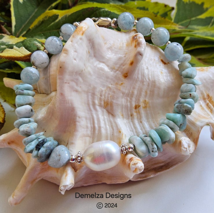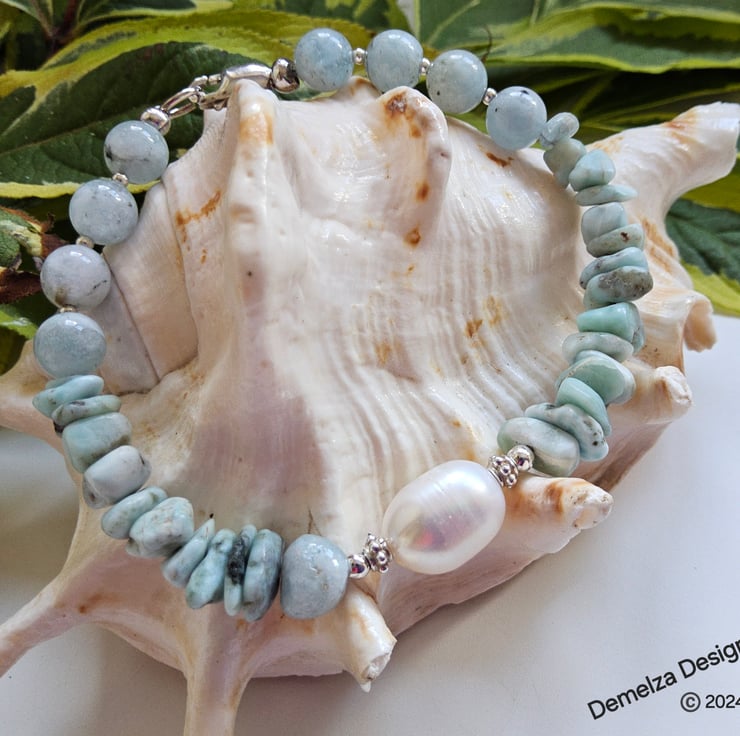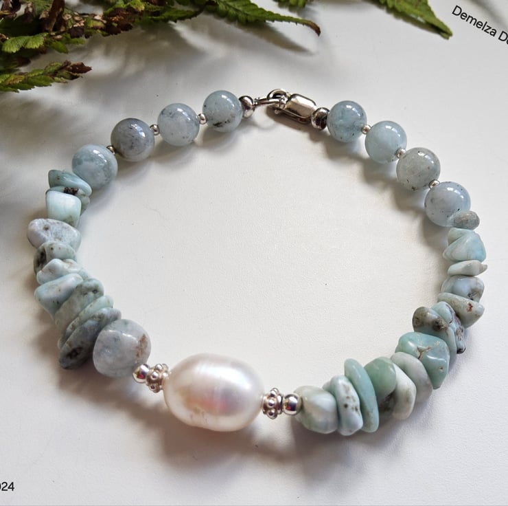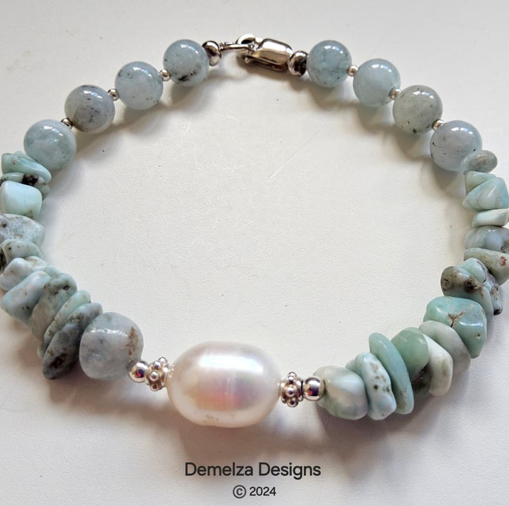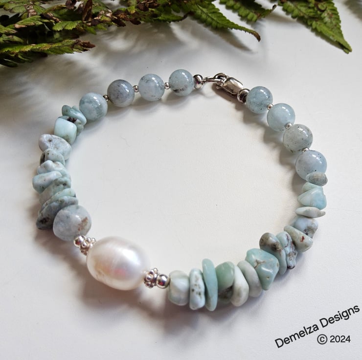A beautiful quality bracelet designed and hand crafted in Cornwall for those seeking something completely different to gift or treat themselves to. In the centre is a large 14mm genuine natural baroque cultured pearl. On either side are medium sized tumbled rare larimar nuggets, followed on with 8mm smooth round cut aquamarine gemstones beads. Within the design are 925 sterling silver spacer beads adding a touch of sparkle.