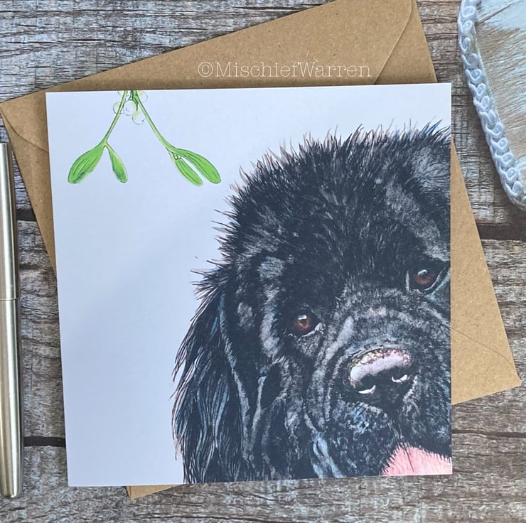 This Newfoundland Christmas card features a print of my ink and watercolour illustration of a black Newfie dog and some mistletoe. Designed, hand drawn, hand painted and printed by me.