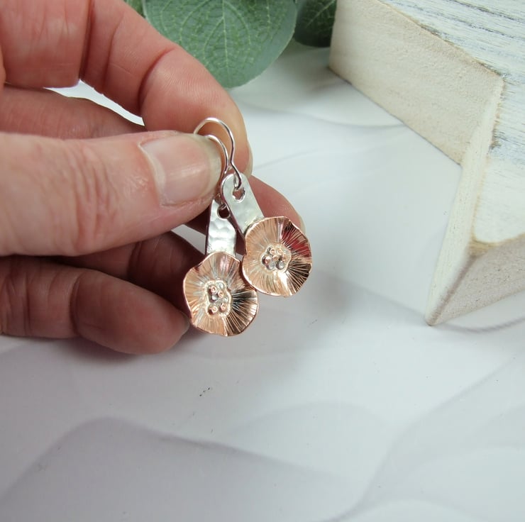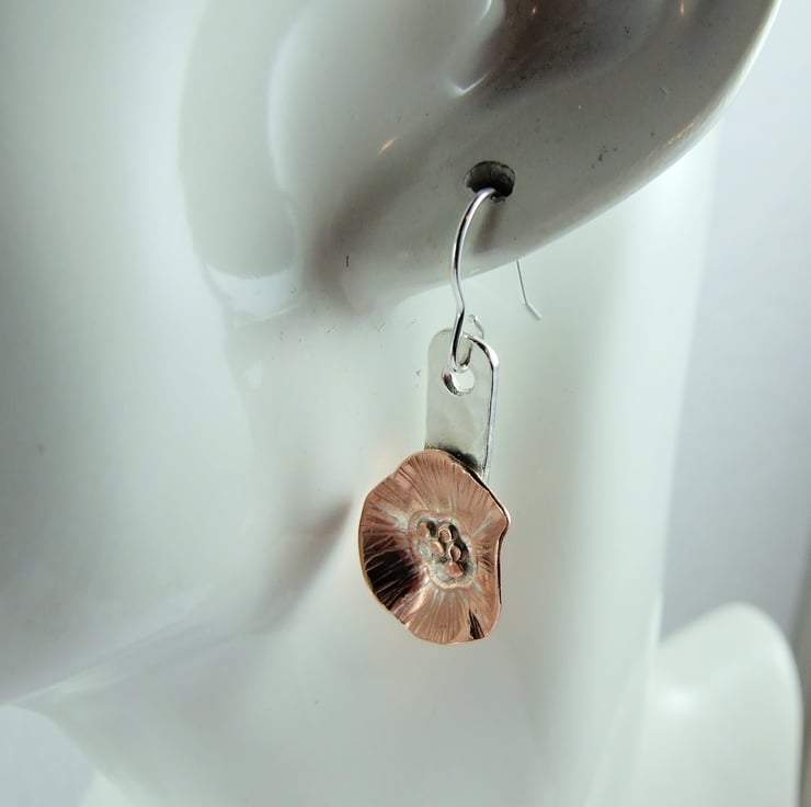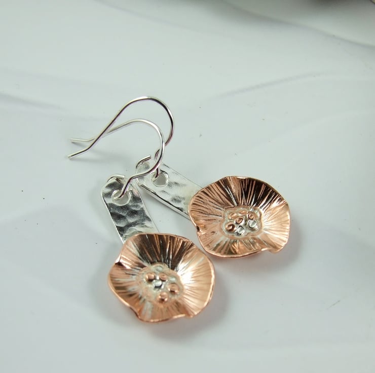 I have freehand cut the poppies from copper sheet, shaped and textured with ahammer then soldered to sterling silver base. At the centre of each poppy I have added tiny copper and silver beads soldered in place and textured. Fitted to sterling silver ear wires.