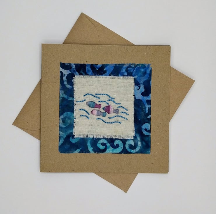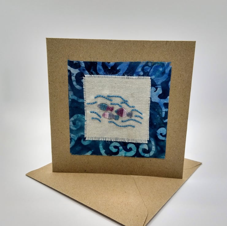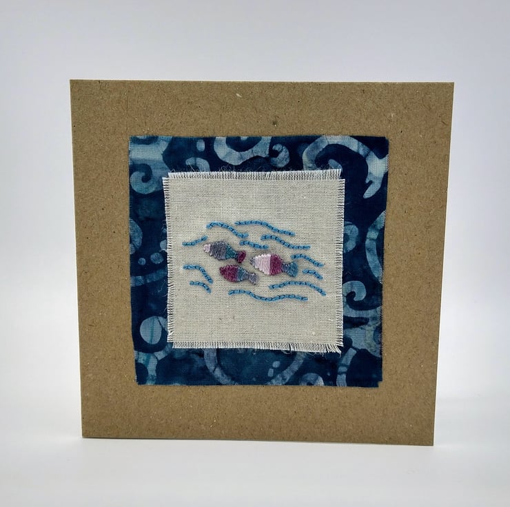 A Greetings card depicting three bright little fish, embroidered onto a natural calico square bordered by a complimentary sea blue batik cotton fabric.