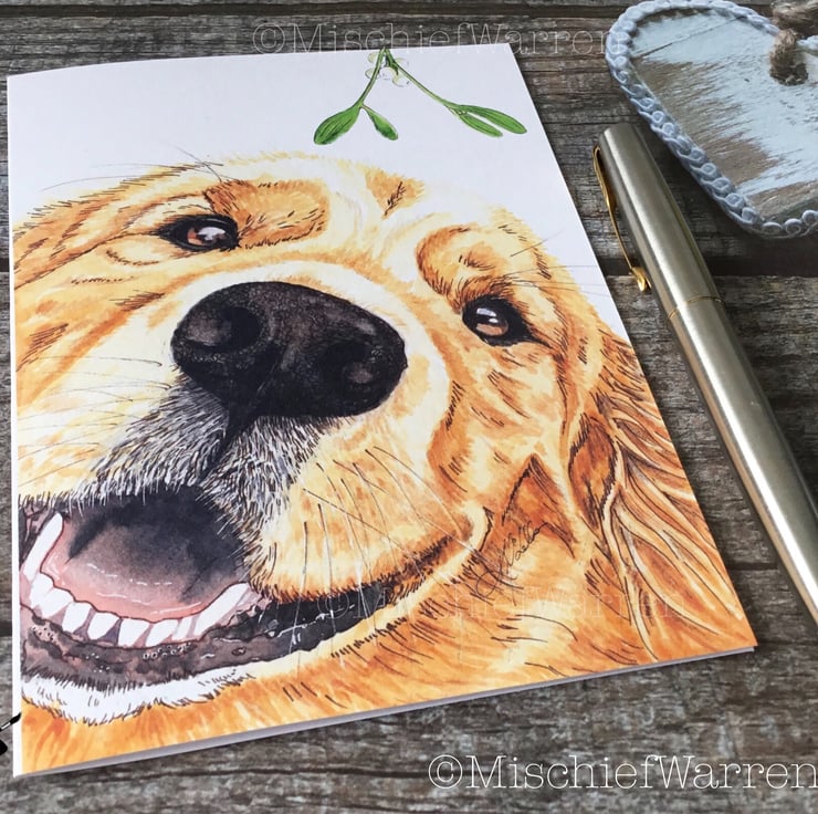 This Retriever Christmas card features a print of my ink and watercolour illustration of a golden retriever dog and some mistletoe. Designed, hand drawn, hand painted and printed by me.