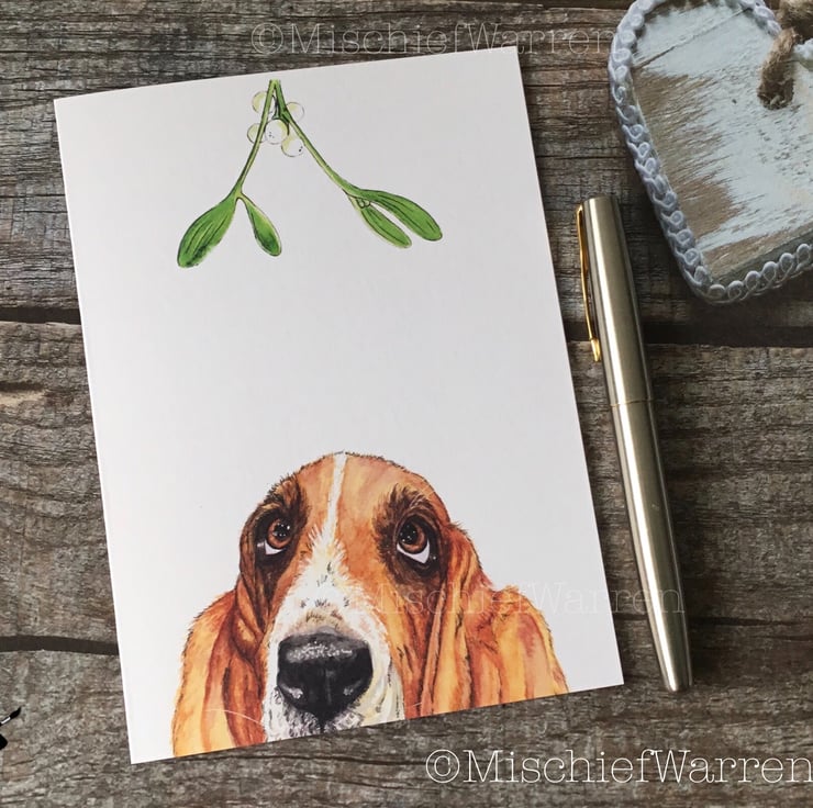 This Basset Christmas card features a print of my ink and watercolour illustration of a basset hound dog and some mistletoe. Designed, hand drawn, hand painted and printed by me.