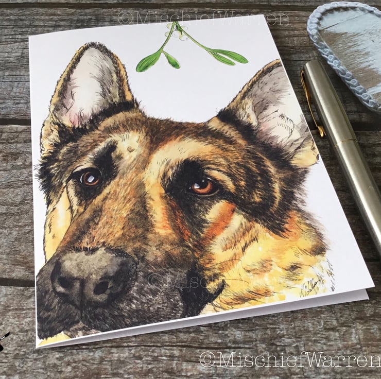 This German Shepherd Christmas card features a print of my ink and watercolour illustration of a sable Alsatian dog and some mistletoe. Designed, hand drawn, hand painted and printed by me.