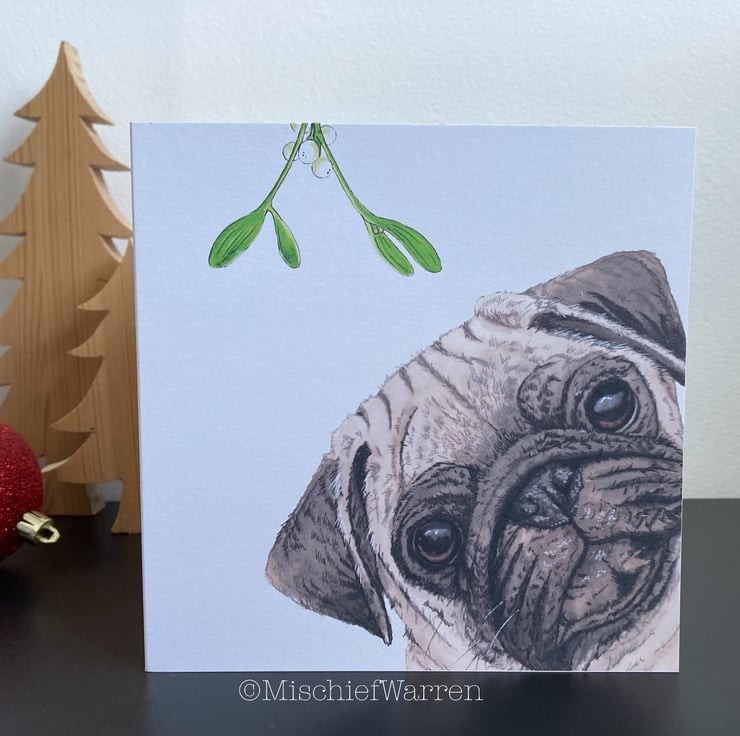 This Pug Christmas card features a print of my ink and watercolour illustration of a Fawn Pug dog and some mistletoe. Designed, hand drawn, hand painted and printed by me.
