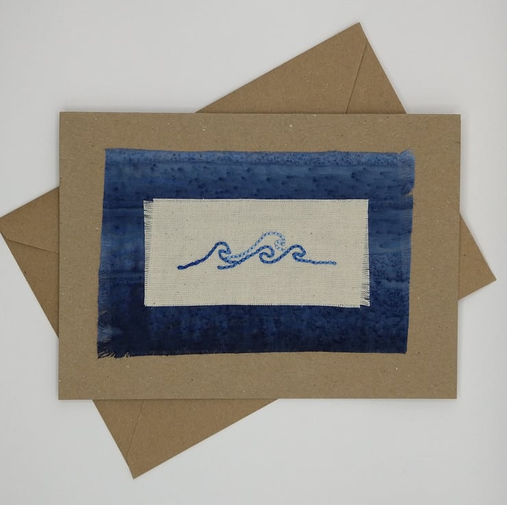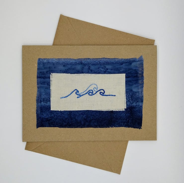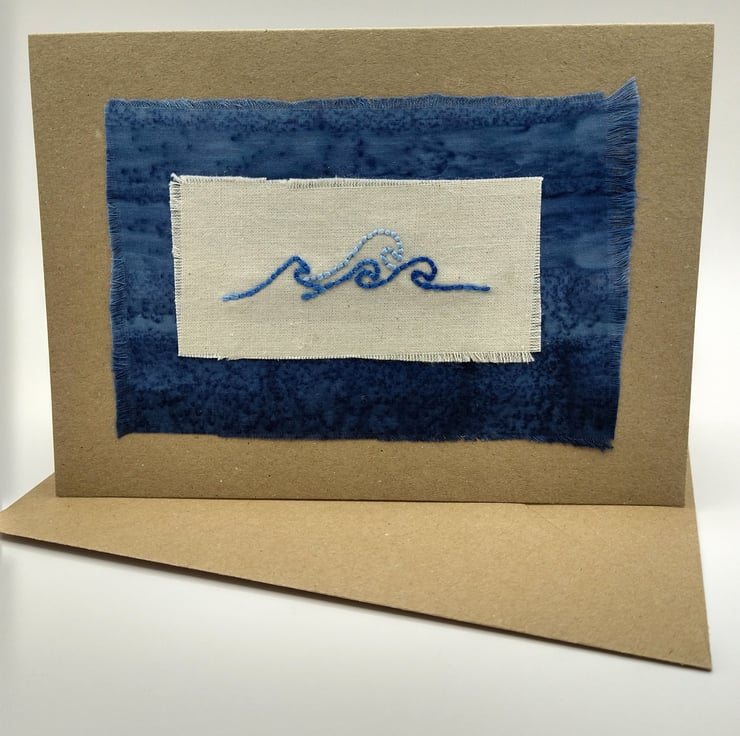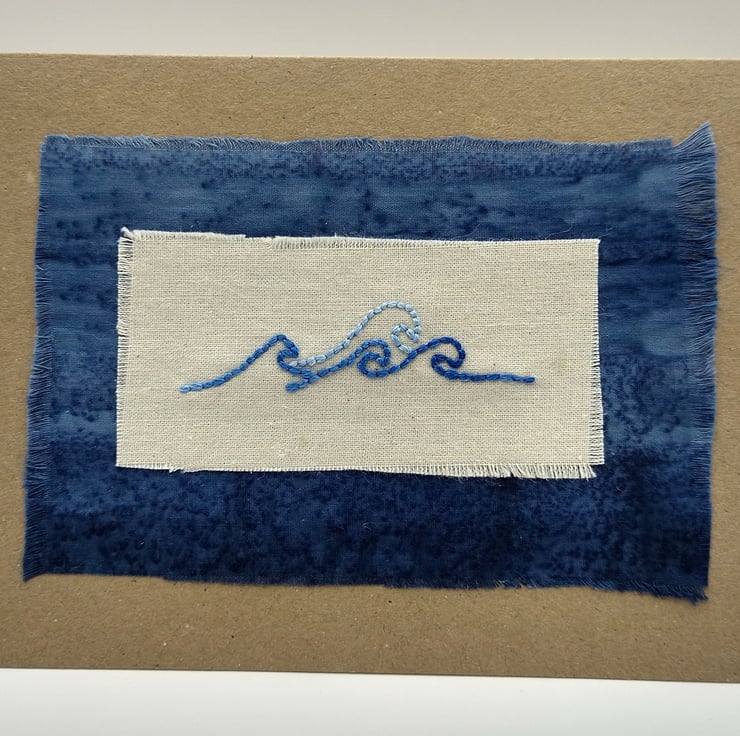 A greetings card, left blank for your own personal message. Ideal as a Birthday card, Thank you card or Notelet. Shades of blue rolling waves hand stitched onto natural calico and bordered by a complimentary sea blue batik cotton fabric. Perfect for any occasion.