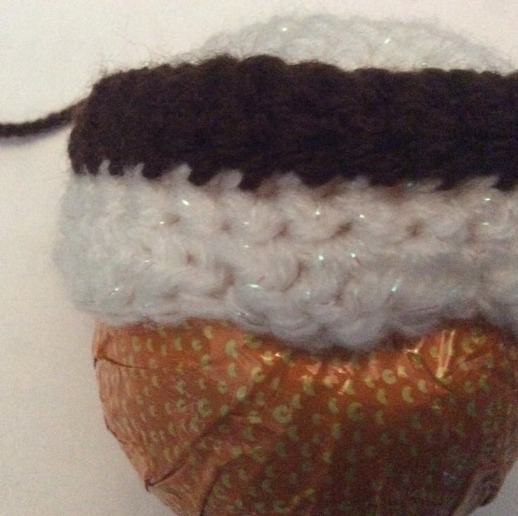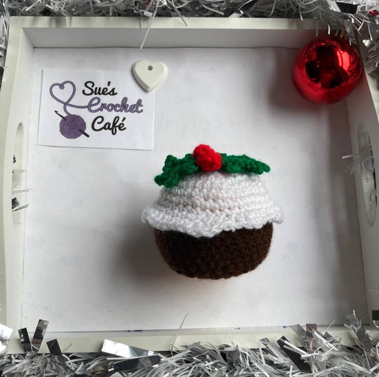 Christmas Pudding crocheted cover for a chocolate orange / Bath bomb/ polystyrene bauble kit designed by me, a crochet teacher based in North Yorkshire.