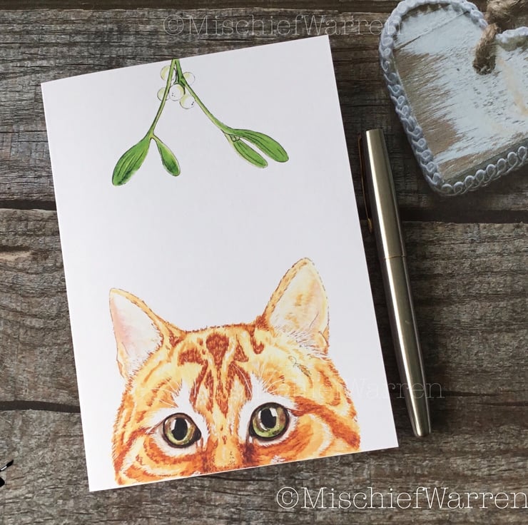This Ginger Cat Christmas card features a print of my ink and watercolour illustration of a ginger tabby cat and some mistletoe. Designed, hand drawn, hand painted and printed by me.