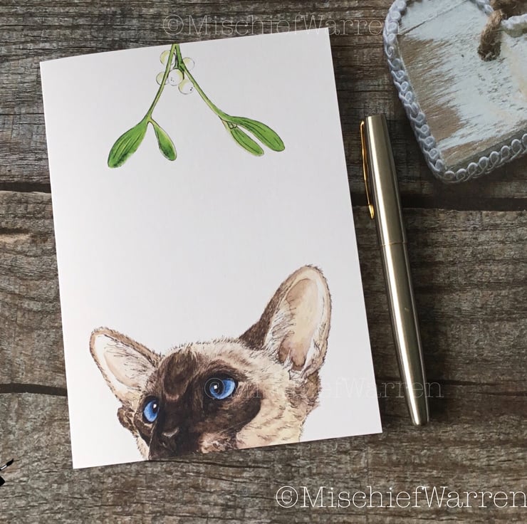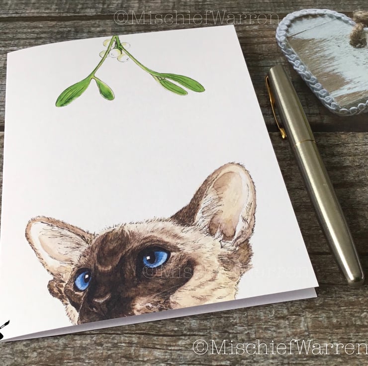 This Siamese Cat Christmas card features a print of my ink and watercolour illustration of a Siamese cat and some mistletoe. Designed, hand drawn, hand painted and printed by me.