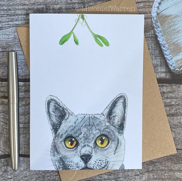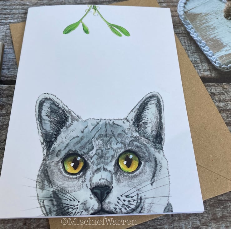 This Grey Cat Christmas card features a print of my ink and watercolour illustration of a Chartreux or British Blue cat and some mistletoe. Designed, hand drawn, hand painted and printed by me.
