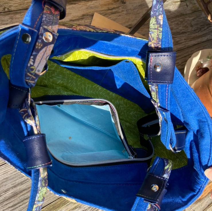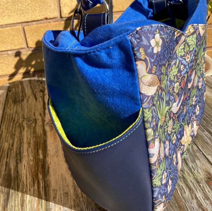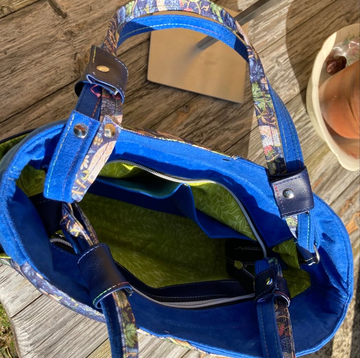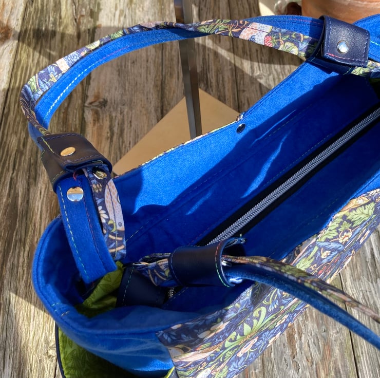 This Handbag has many pockets, the hidden front and back external pockets are just the right size to slip your mobile phone into, there are two external side pockets and internally you will find a large zip pocket and a slip pocket divided into two halves with top stitching finished off with a silver stud. The Beautiful Blue William Morris Print is enhanced with the contrast of Blue brushed velvet fabric, making it feel wonderfully soft and strokable. There is a top zip, to make sure that your bag is secure, finished with a silver daisy charm zip pull. The strap handles to this roomy bag, are multi-tonal with both the William Morris fabric and the Blue brushed velvet, finished with riveted handle cuffs in contrasting faux leather. The straps are long enough to wear the bag on your shoulder or just over the crook of your arm.