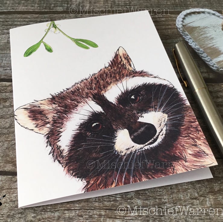 This Raccoon Christmas card features a print of my ink and watercolour illustration of a racoon and some mistletoe. Designed, hand drawn, hand painted and printed by me.