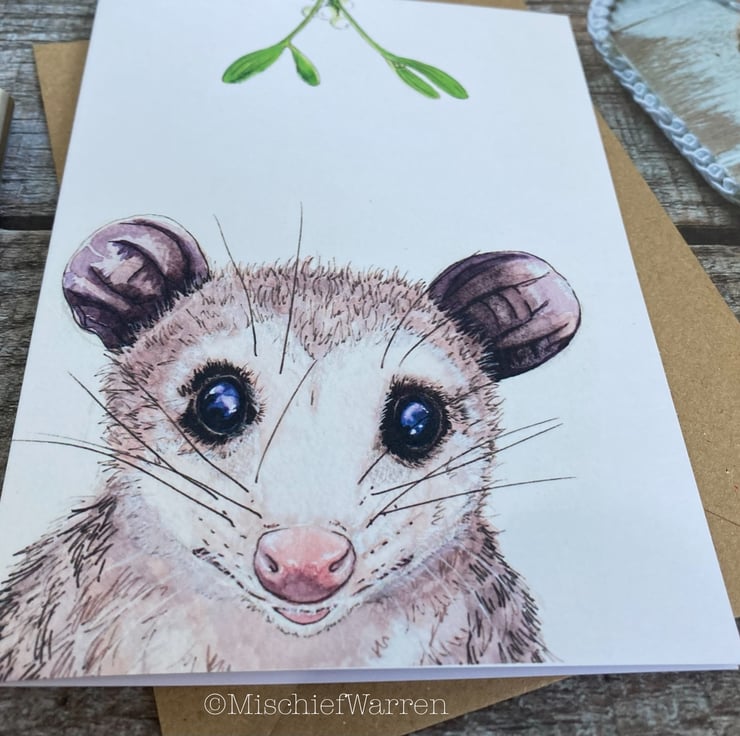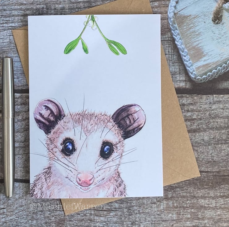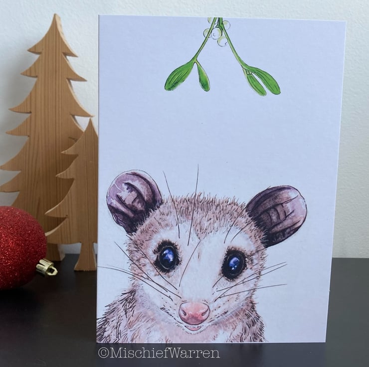 Possum Christmas Card. Opossum handmade Christmas card.