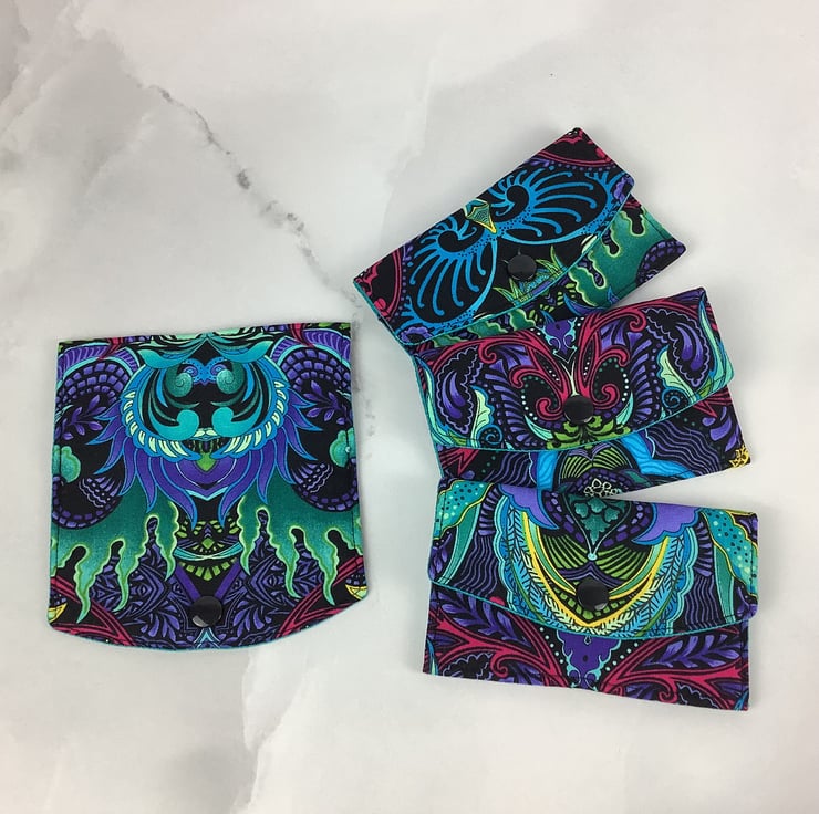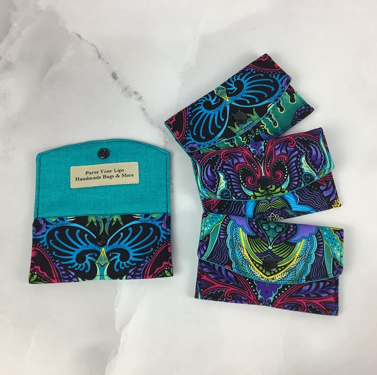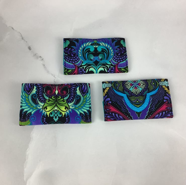 Each of my unique card cases is individually made by me in my relaxing and tranquil little West Sussex garden studio so the pattern placement and popper may vary slightly.