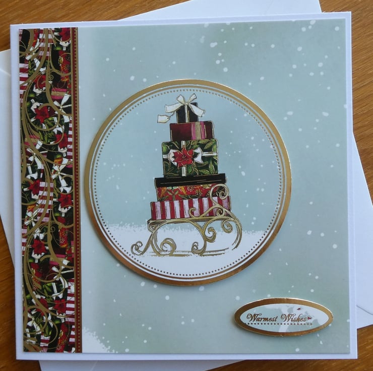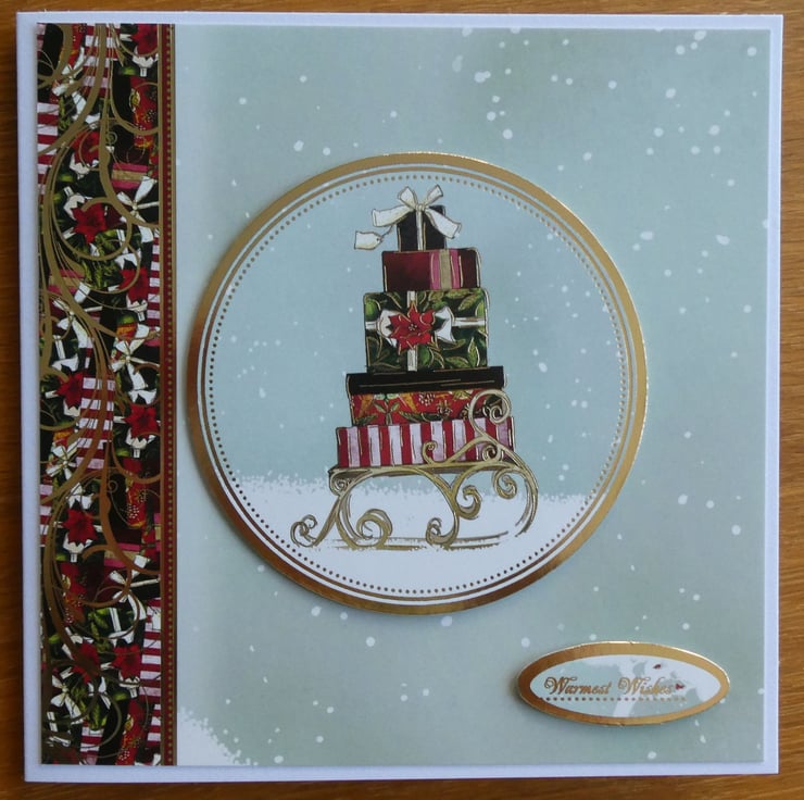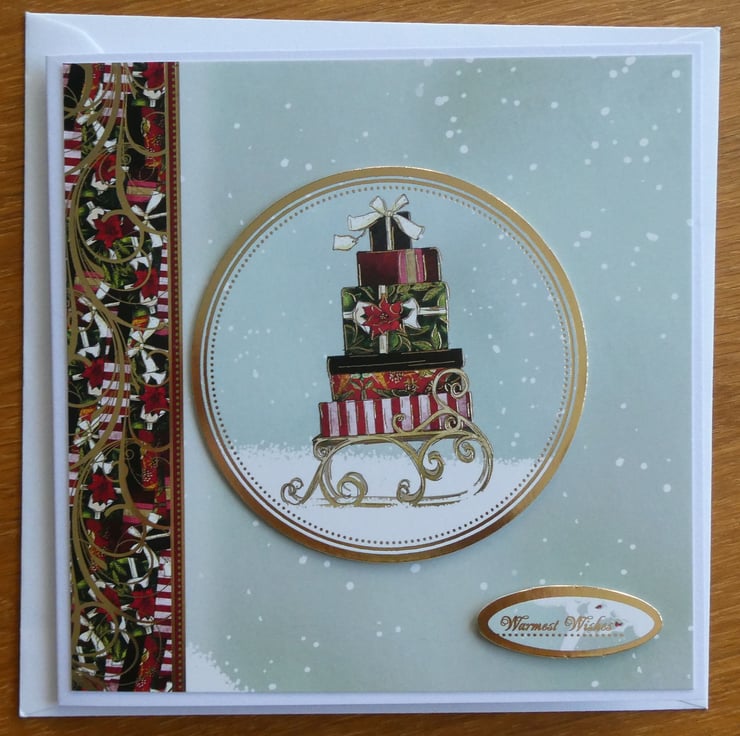 This one of a kind handmade Christmas card in shades of black, red and soft green has an image of a stack of presents on a sleigh and the message Warmest Wishes.