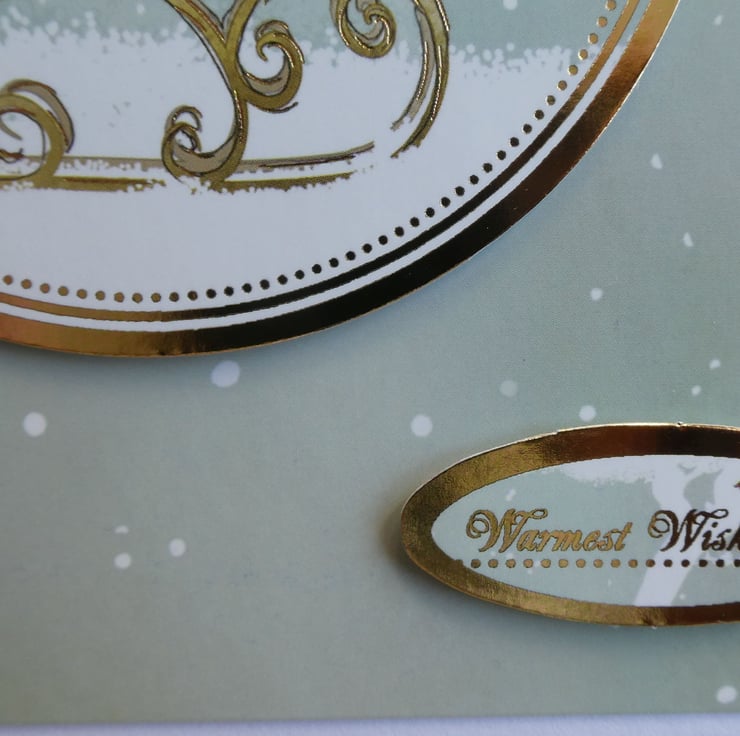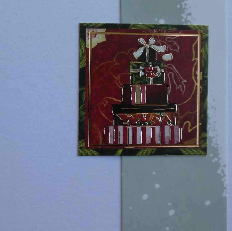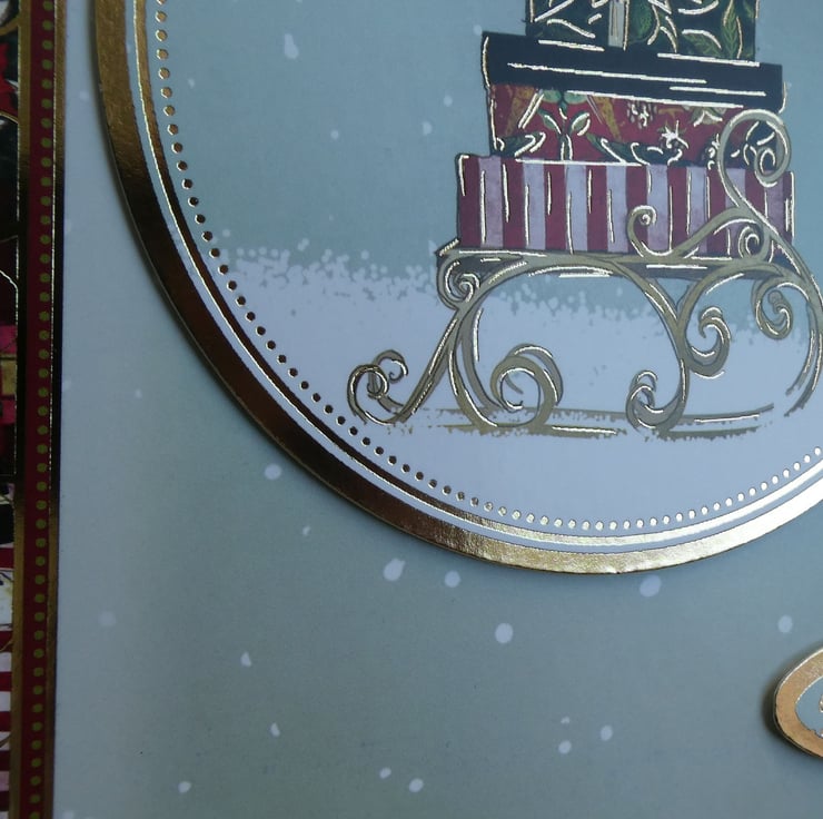 The front of the card has a printed snowy soft green and cream background with a band of golden swirls and black and deep red parcels down the left hand side on quality gloss card.