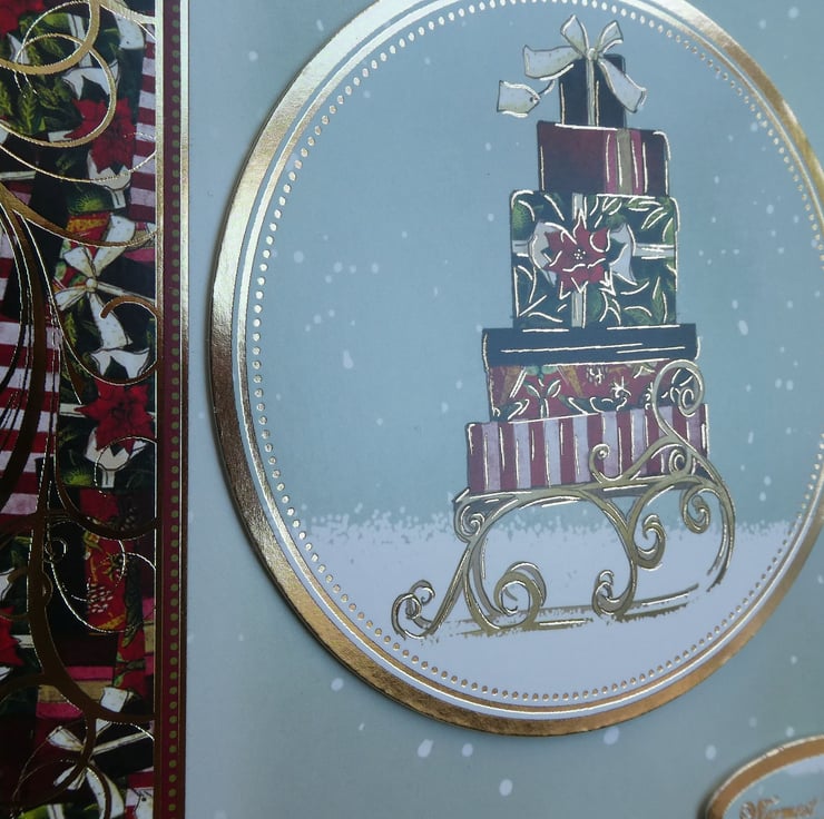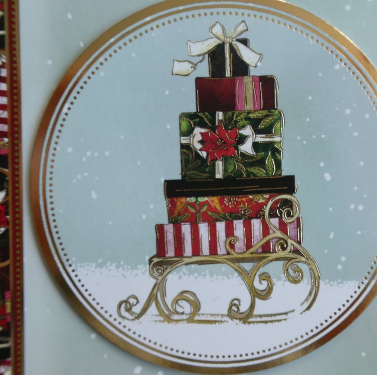 A central circular card topper has an image of a pile of presents wrapped in dark green and red with cream and gold accents sitting on top of a golden sleigh in the snow.