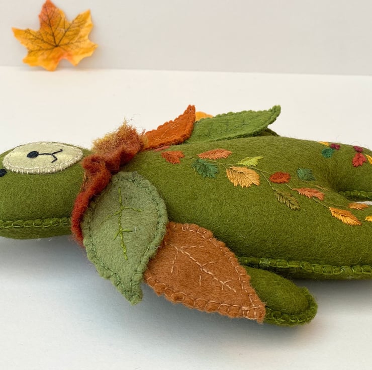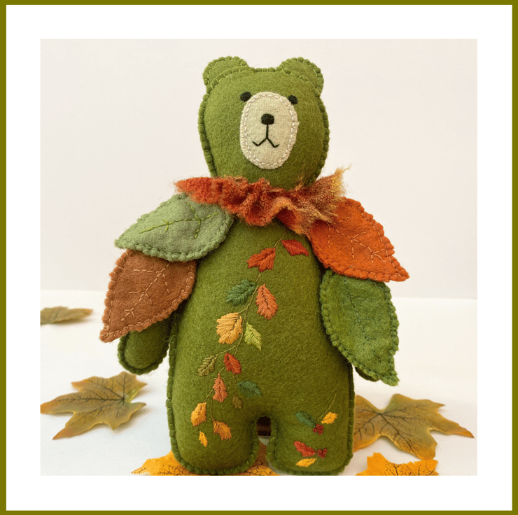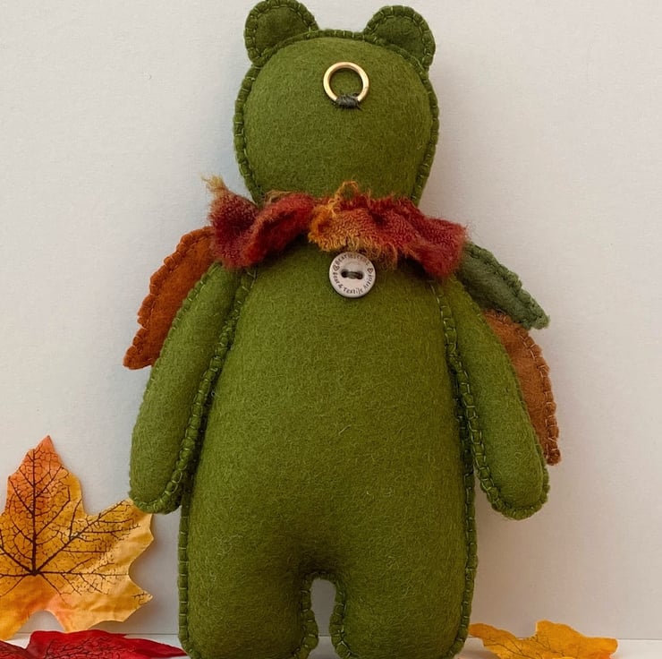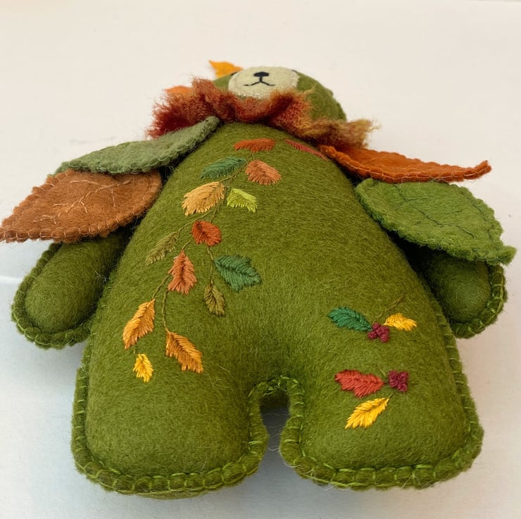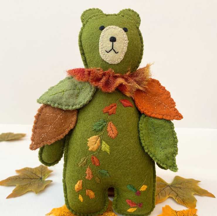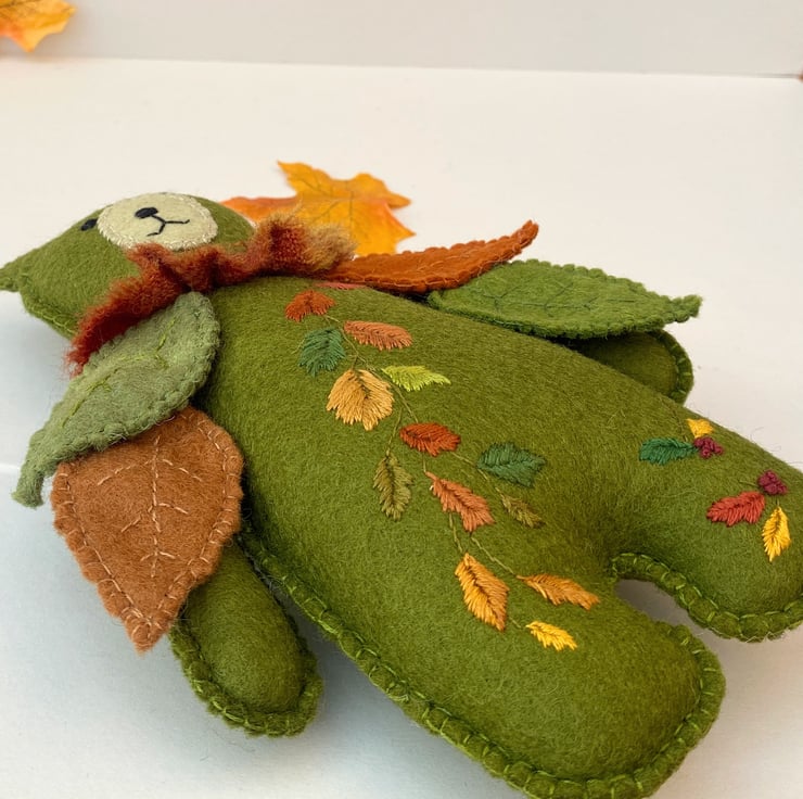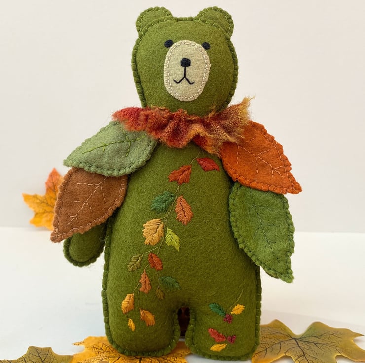 8" tall woodland teddy bear designed as a collectable wall hanging. Triple hand sewn seams give extra stability to this 100% wool felt rich moss green bear. Designed in a new Autumn theme he has been hand embroidered with a trail of Autumn leaves in burnt oranges, red, greens and golds and has hand sewn seperate leaves attached to his shoulders/upper body.