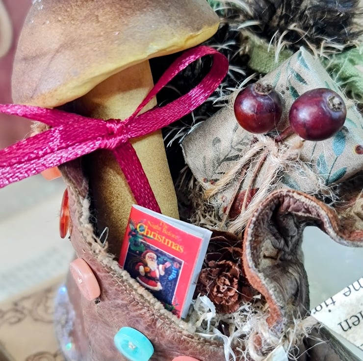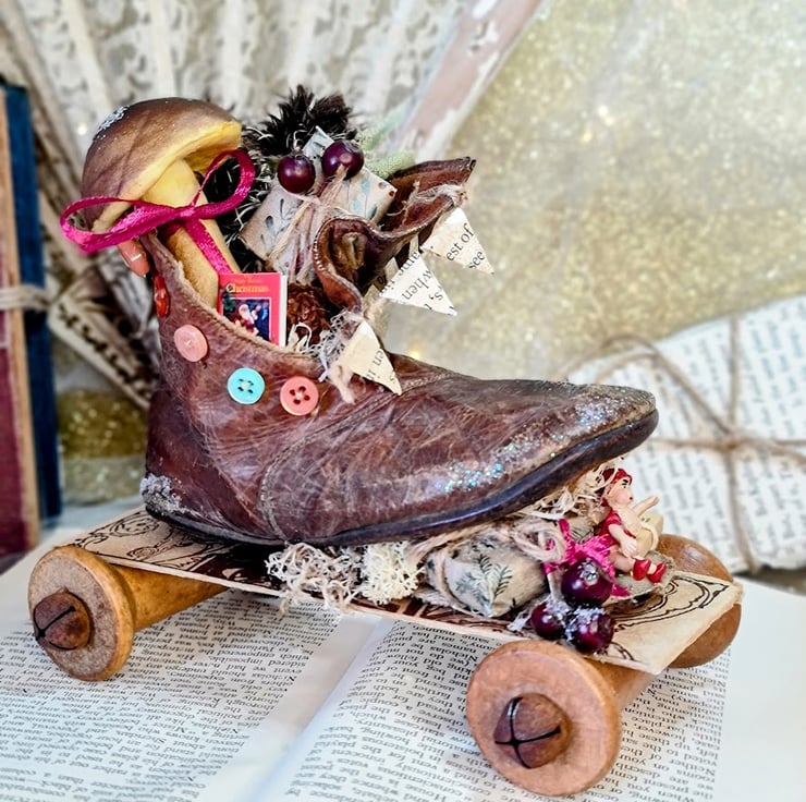 This original little piece is handmade in mix media. The two little moles are hand and machine stitiched in unbleach cotton with mohair fur. They are sitting in their little boot cart which is one of a pair of childrens edwardian boots, mounted on an old book spine with wooden cotton reels for wheels. Their old jalopy is packed with presents toy and a little Christmas book. As well as a toadstool adorned with a red satin ribbon. All on top of straw and dries moss so they will be toasty warm on their journey.