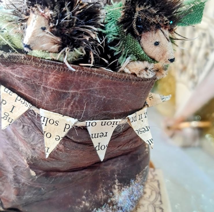 Handmade two little hedgehogs in an edwarian boot soft textile art