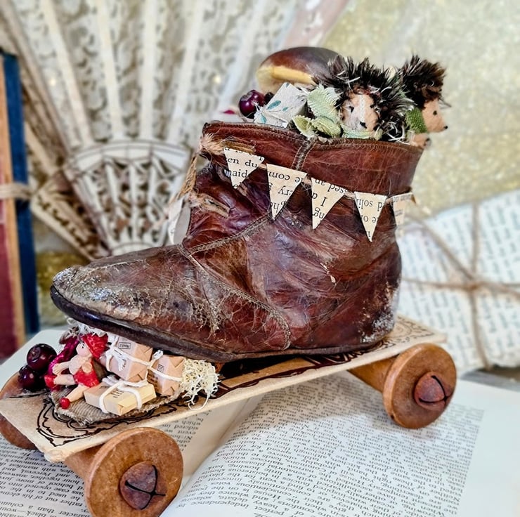 Inspired by this childs boot one of a pair it was the most damaged with the sole coming apart. I coudn't resist thinking of something spilling out of the gap. So the story of the two little moles making their way to visit relatives with gifts a plenty took shape. Sat peeping over the top with their little scarves blowing in the wind. Possibly singing carols all the way their little boot cart glistening with a peppering of magical frost.
