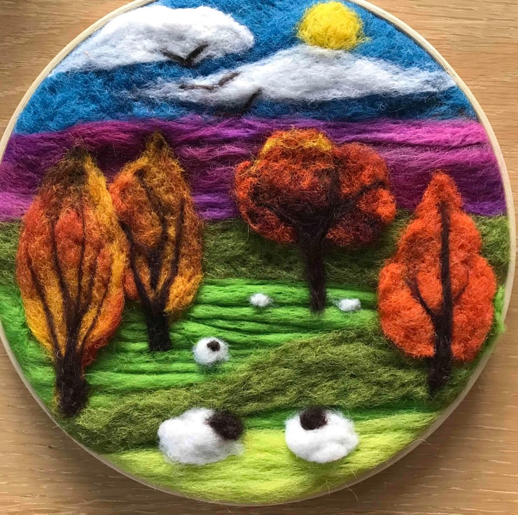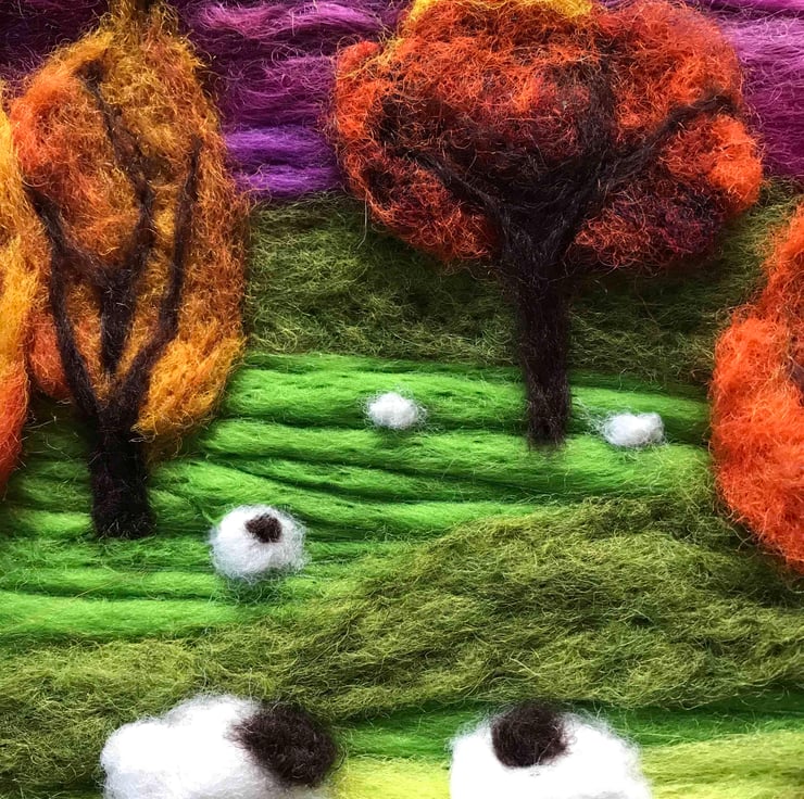 Stylised trees in basic shapes and block colours, softened by five sheep.