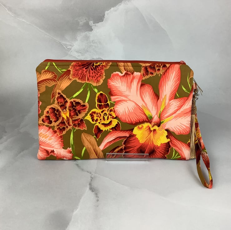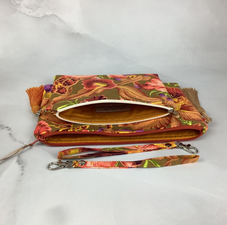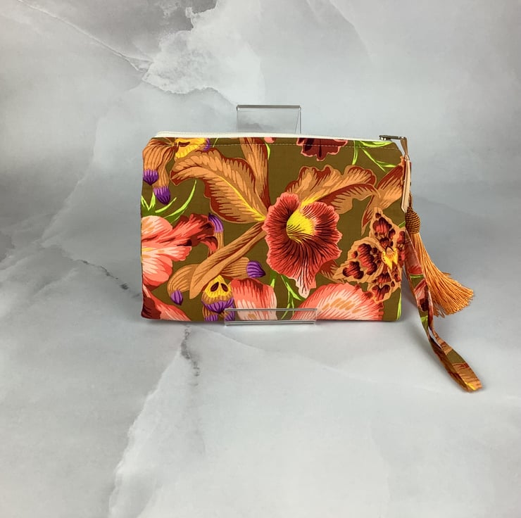 Handmade zip clutch bag in stunning floral cotton fabric and lined in a rich mustard cotton.