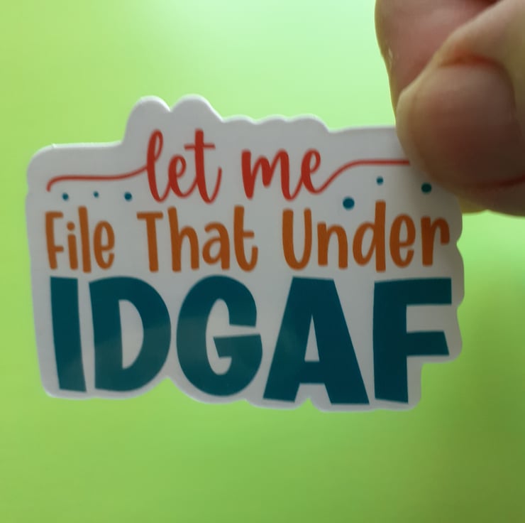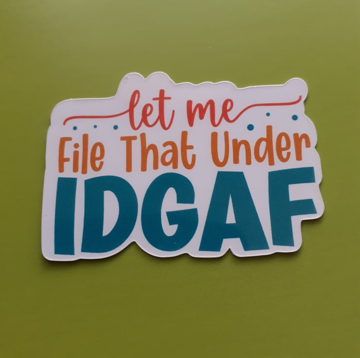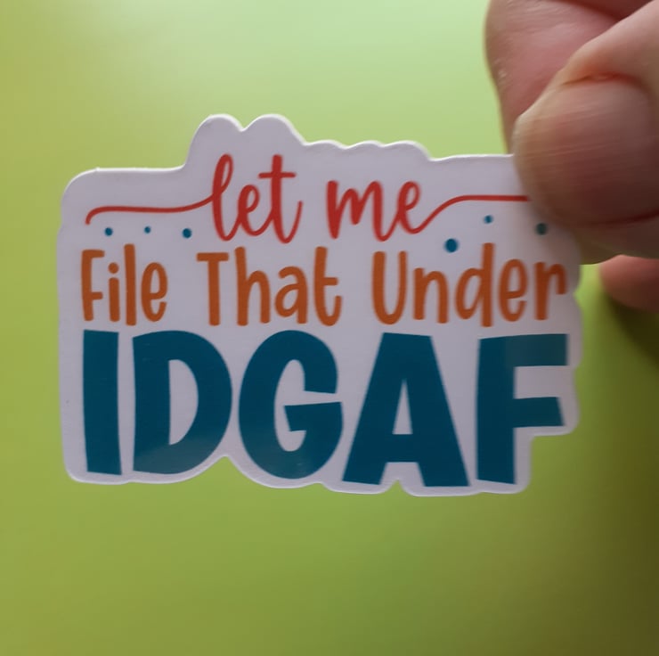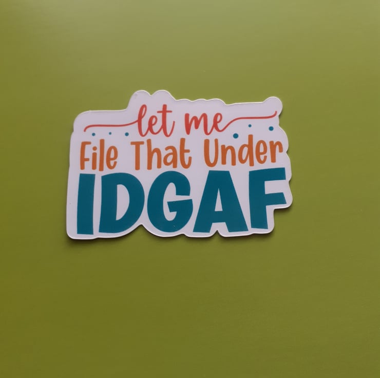 Add a touch of humour and sass to your day with this 2.5 x 1.5 inch. "Let Me File That Under IDGAF" vinyl sticker! Perfect for your laptop, water bottle, notebook, or anywhere you want to share your carefree attitude. This sticker is made of high-quality, durable vinyl that’s water-resistant and scratch-resistant, ensuring it stays bold and bright wherever you stick it. Ideal for those who appreciate witty and sarcastic designs, it’s a great conversation starter and makes a fun gift for friends or co-workers..