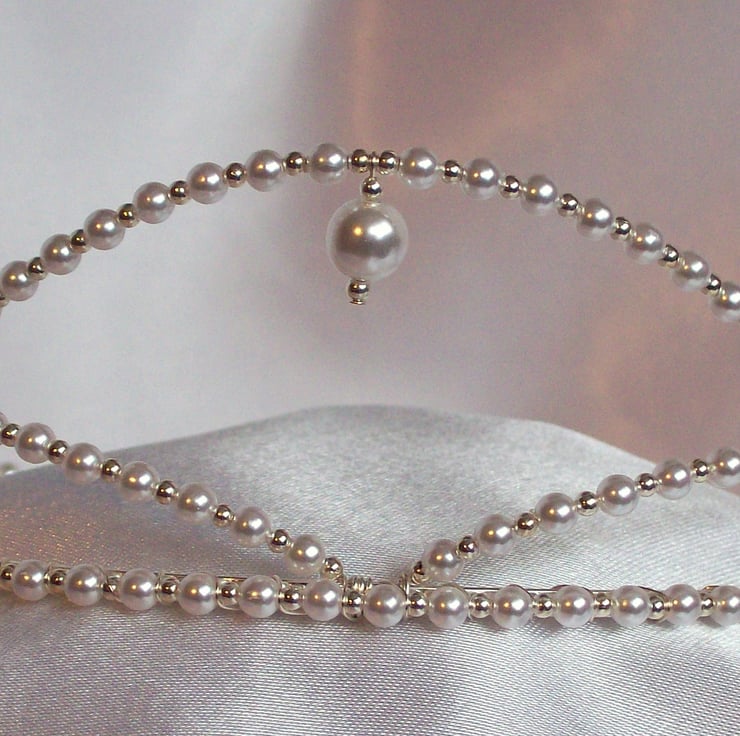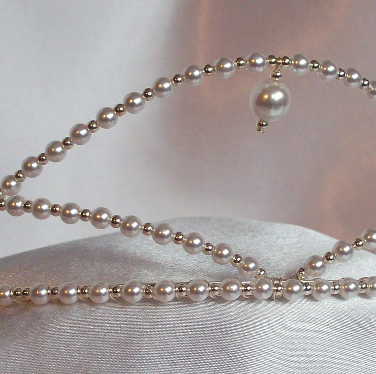 White pearl like beads with silver plated spacer beads adorn this silver plated tiara band.