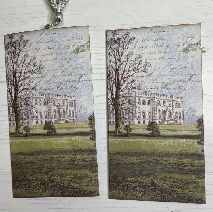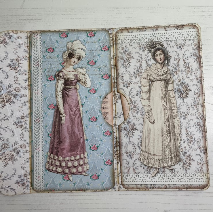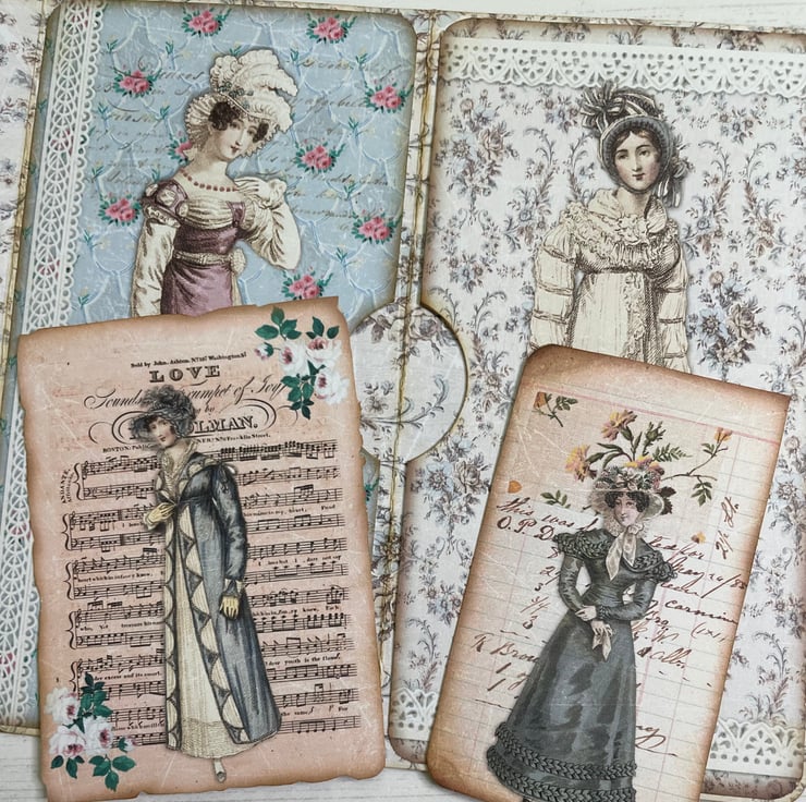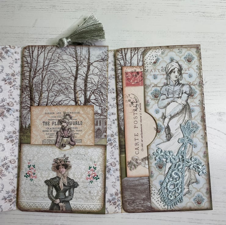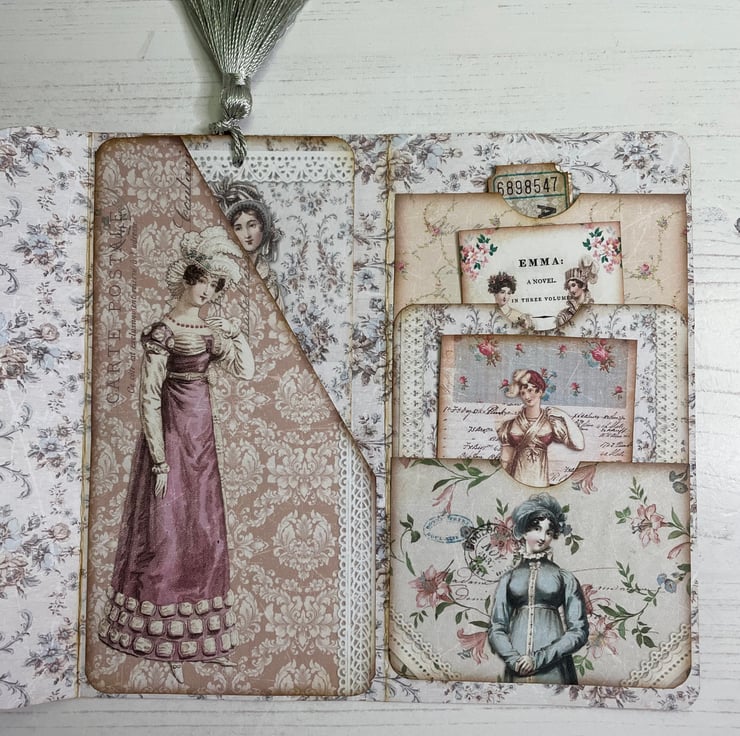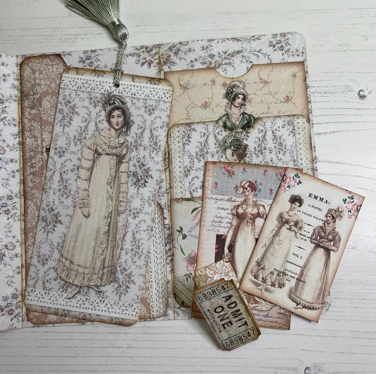 Set of 2Jane Austen flip folios. With pockets, 6 Journalling card, 2 ticket stubs and a bookmark with sage green tassel. Pockets and tuck spots. Each folio is different. Perfect as a gift for a Jane lover. Measures 6.75” x 3.5”
