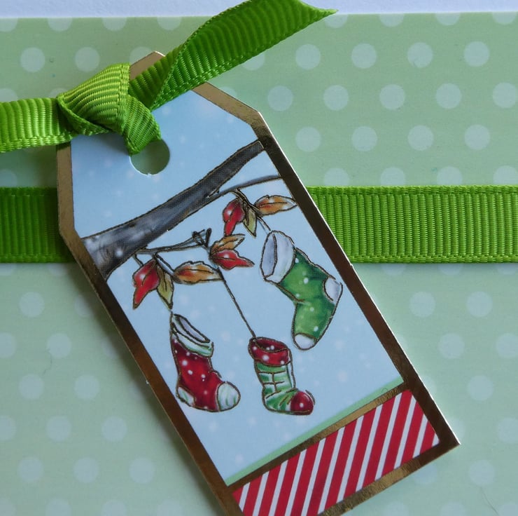 A band of green grosgrain ribbon has been wrapped around the top of the card, topped with a tag shaped image of 3 Christmas stockings hanging from a branch. The tag has been tied with matching ribbon and raised on foam pads.