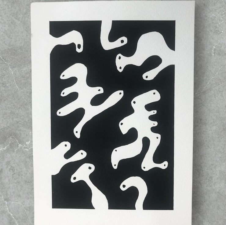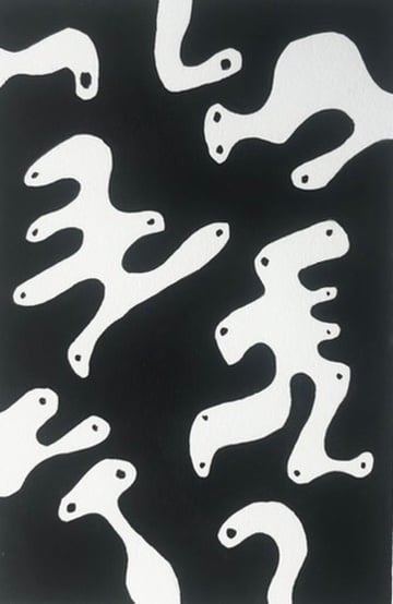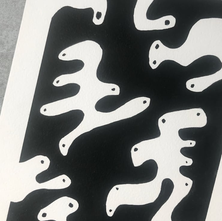 Some would say my sense of humour is childish for my age, but actually it's a case of whatever makes me happy. For this artwork I just stated with black ink and paper and create the mark intuitively, the blobs turned into characters!